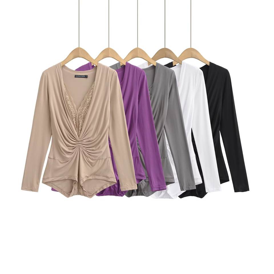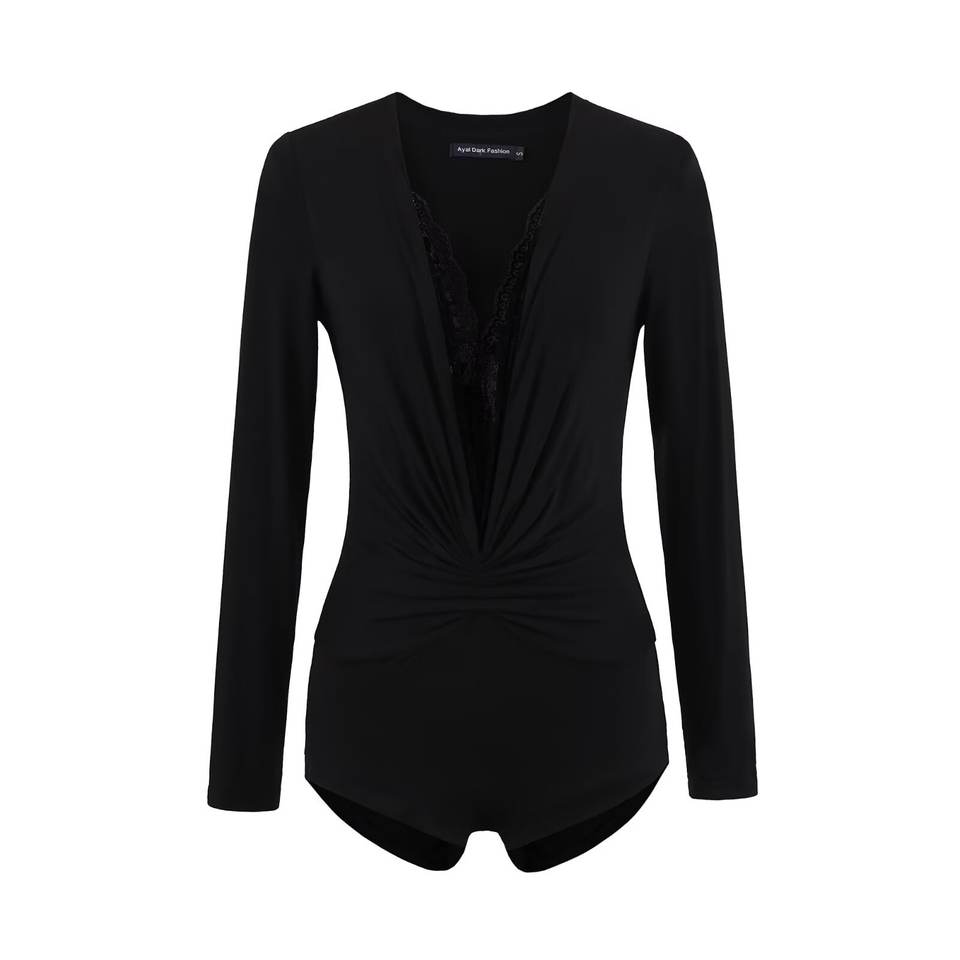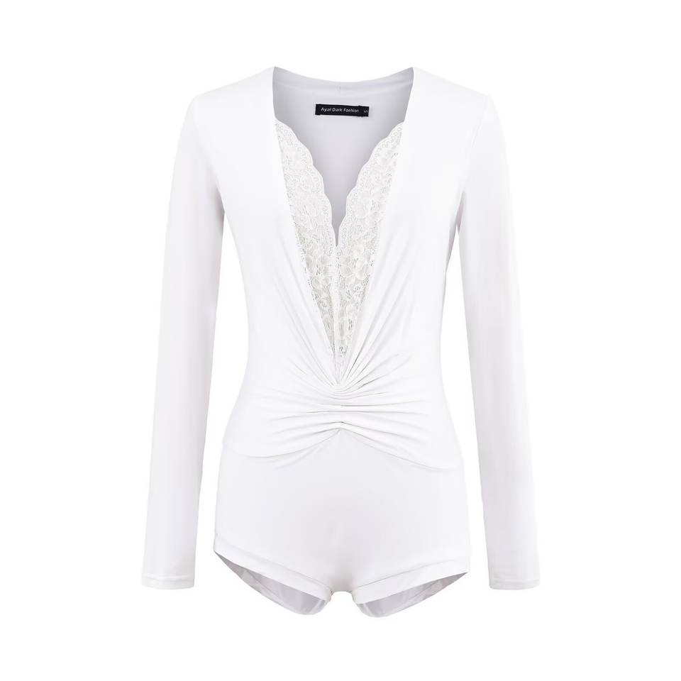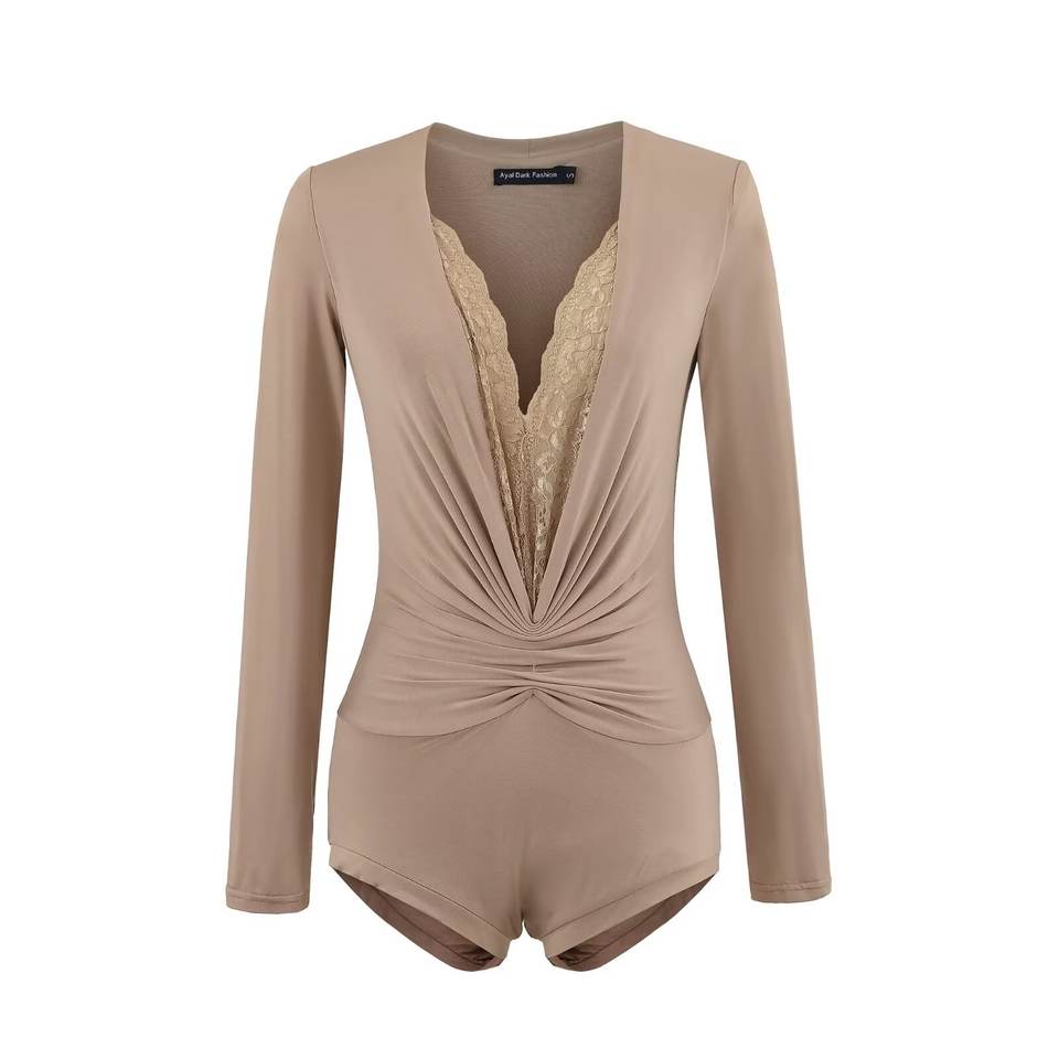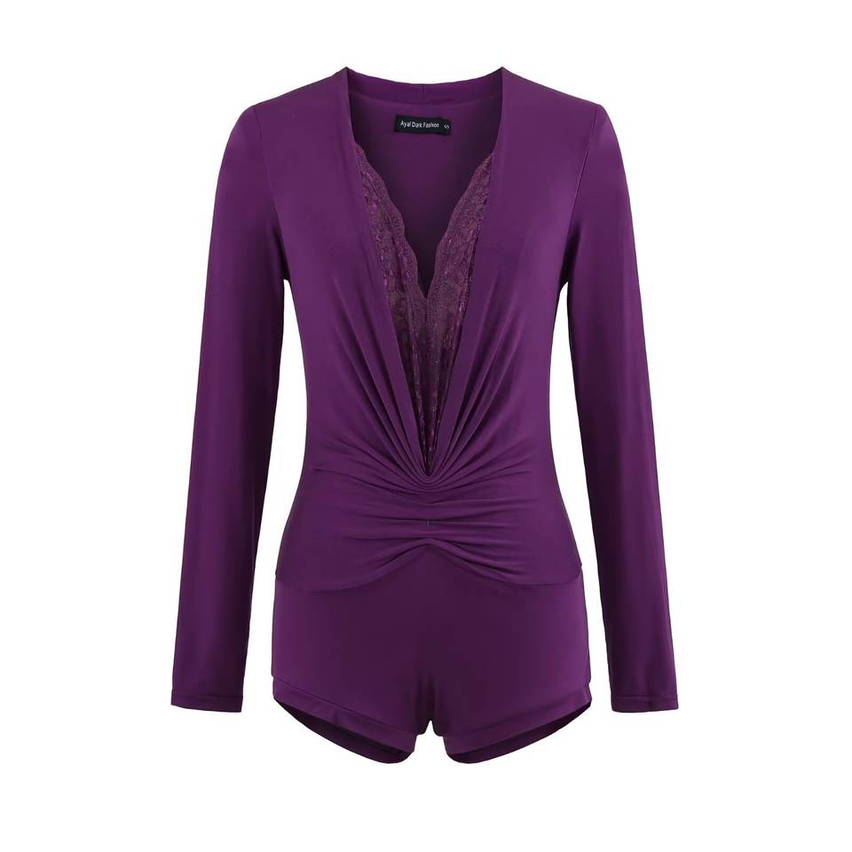 ชุดเซ็กซี่สำหรับฤดูร้อน Jennie คอวีลึก แขนยาว กางเกงขาสั้นสำหรับผู้หญิง ลายเรียบ ดีไซน์รัดรูป ทรงเข้ารูป ผ้ากันยับ น้ำหนัก 120 กรัม
