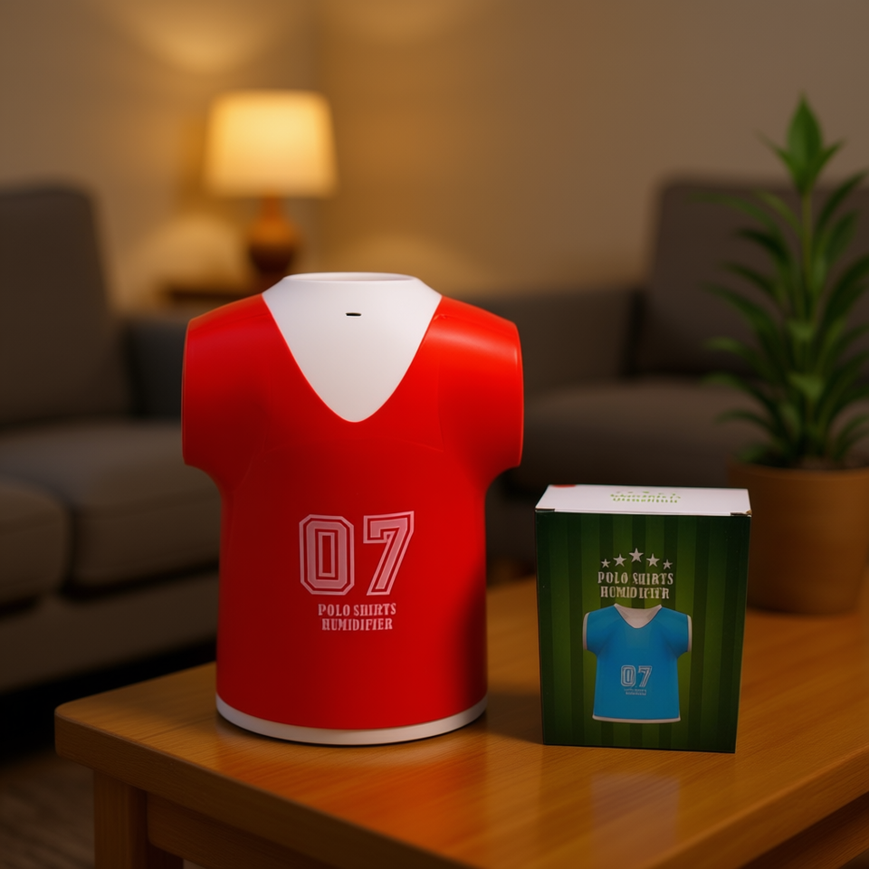 เครื่องเพิ่มความชื้นในอากาศแบบตั้งโต๊ะ รุ่น Polo Shirts Humidifier 07 สีแดง ดีไซน์เสื้อเจอร์ซีย์ ใช้ในบ้าน พร้อมไฟกลางคืน ควบคุมด้วยระบบสัมผัส ใช้พลังงานจาก USB