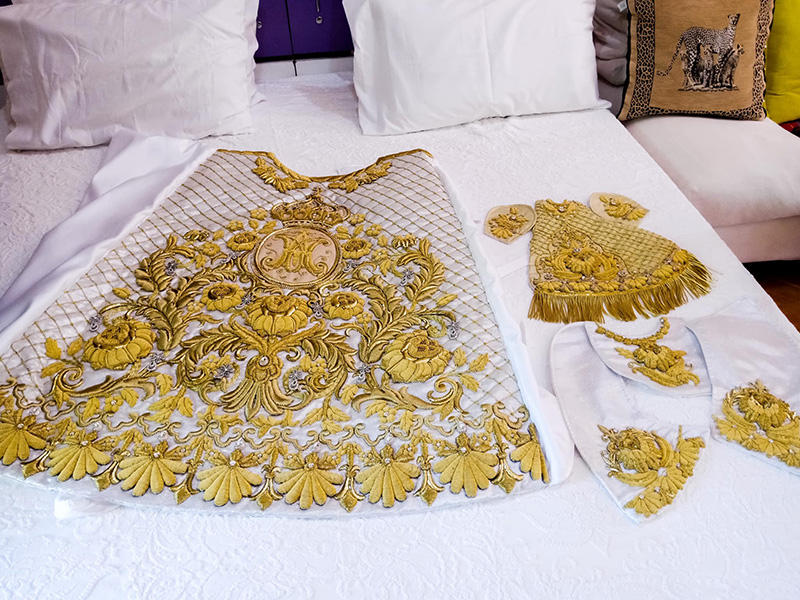 ชุดพระเยซูปักลายทอง กระโปรงเดรส ชุดศาสนา งานปักมือสั่งทำพิเศษ สีขาวทอง ชุดสูทสั่งตัดได้ งานปักมือสำหรับงานปาร์ตี้ ทันสมัย