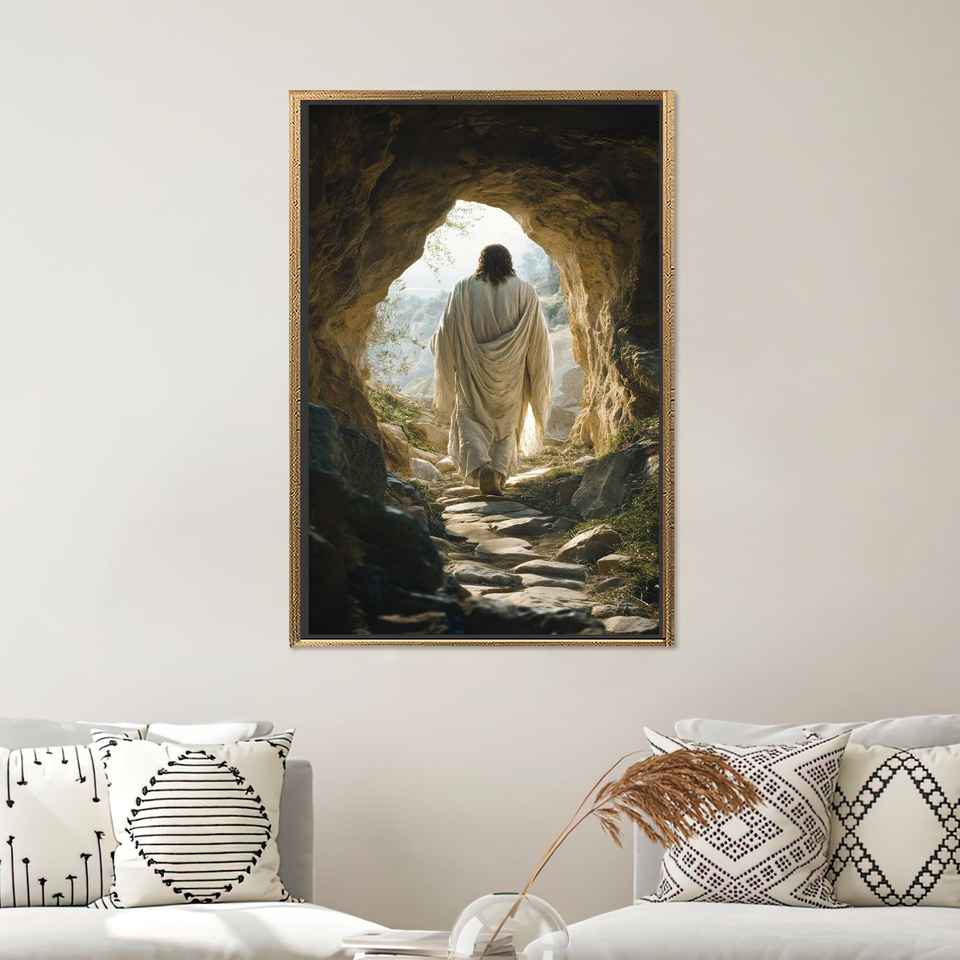 ภาพพิมพ์บนผ้าใบพระเยซูฟื้นคืนชีพ: ฉากในพระคัมภีร์สีเบจ, ภาพพิมพ์ตกแต่งแห่งศรัทธา, ผ้าใบกรอบทอง