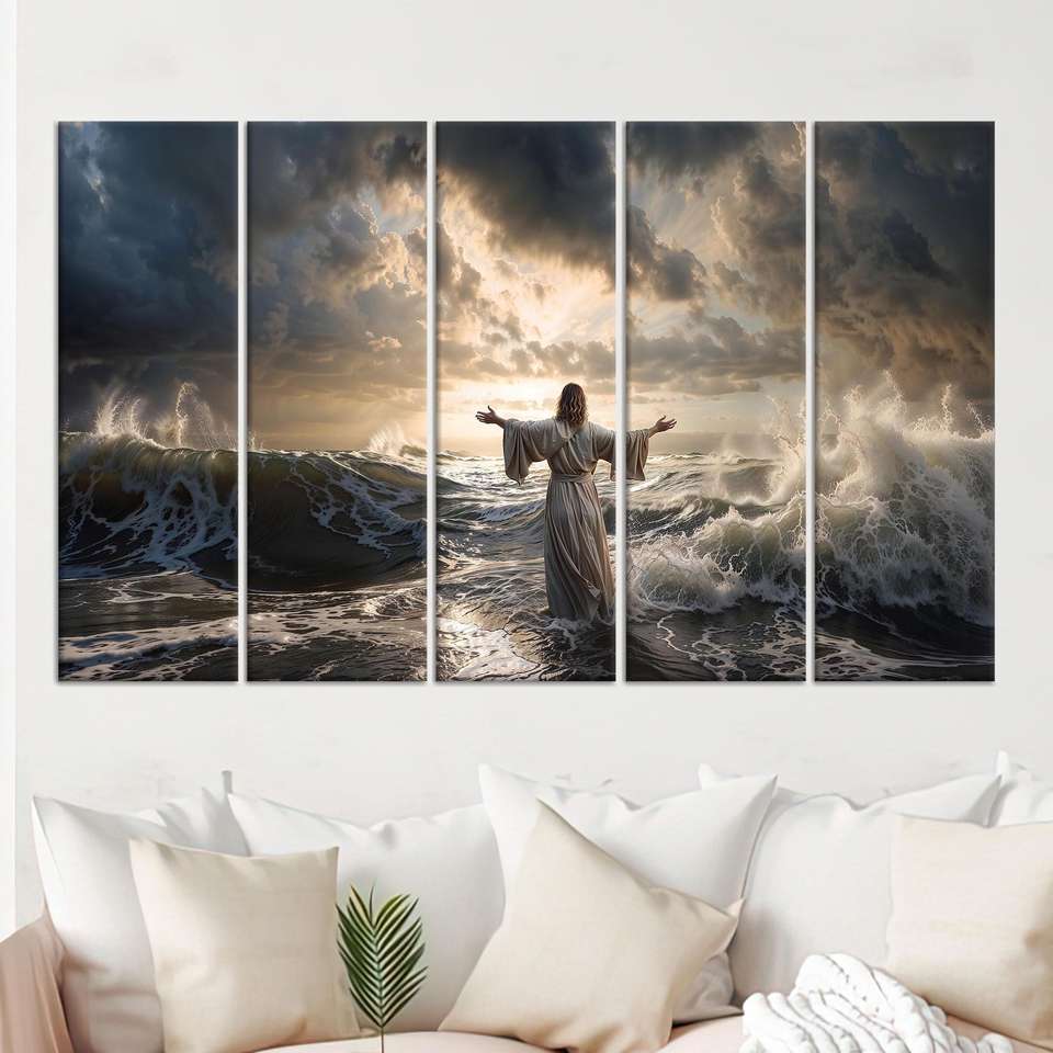 ภาพพิมพ์บนผ้าใบพระเยซูเดินบนน้ำ ศิลปะตกแต่งผนังแนวจิตวิญญาณ ท้องทะเล สายฟ้า และแสงสว่าง ชุดผ้าใบ 5 ชิ้น