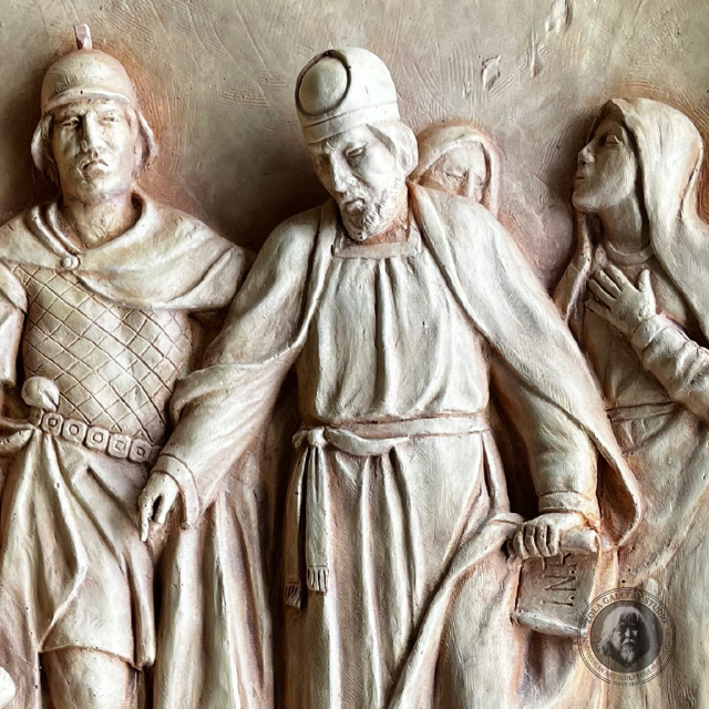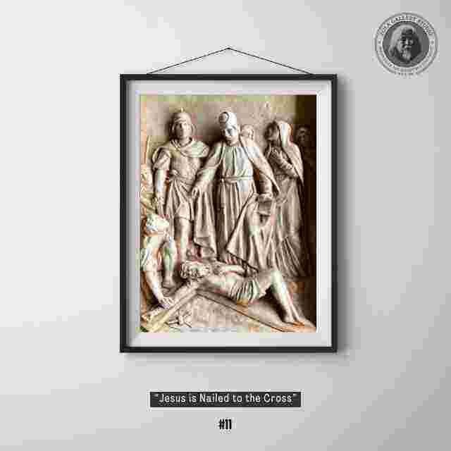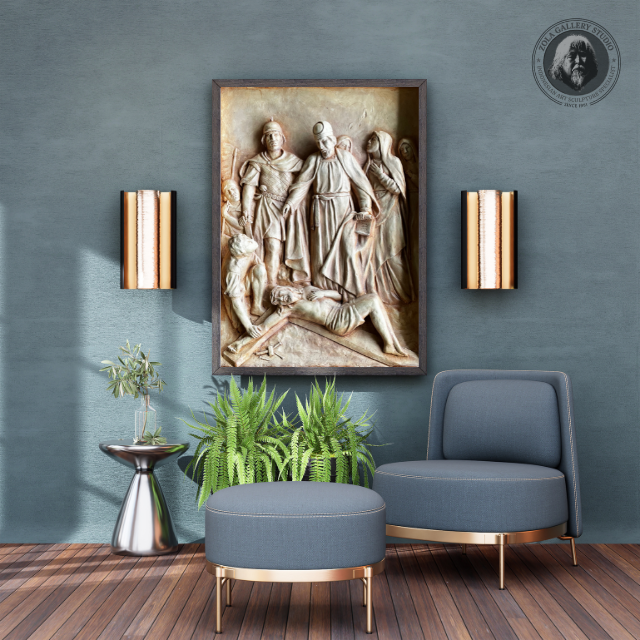 พระเยซูถูกตอกที่กางเขนเพื่อบรรเทาสร้างชิ้นโฟกัสที่โดดเด่นที่ให้เกียรติเสียสละอย่างลึกซึ้งในพื้นที่สไตล์ศักดิ์สิทธิ์หรือแกลเลอรี่