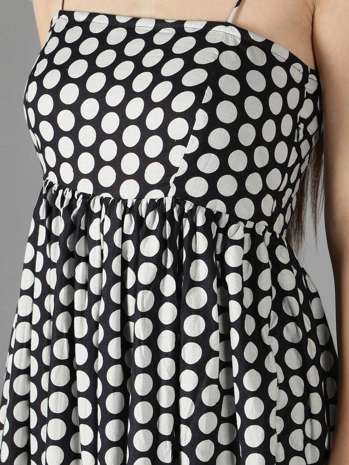 ชุดเดรสผ้าคอตตอนผูกติดไหล่ลายจุดสีดำและสีขาวชุดปาร์ตี้แฟชั่นชุดตะวันตกสำหรับผู้หญิง