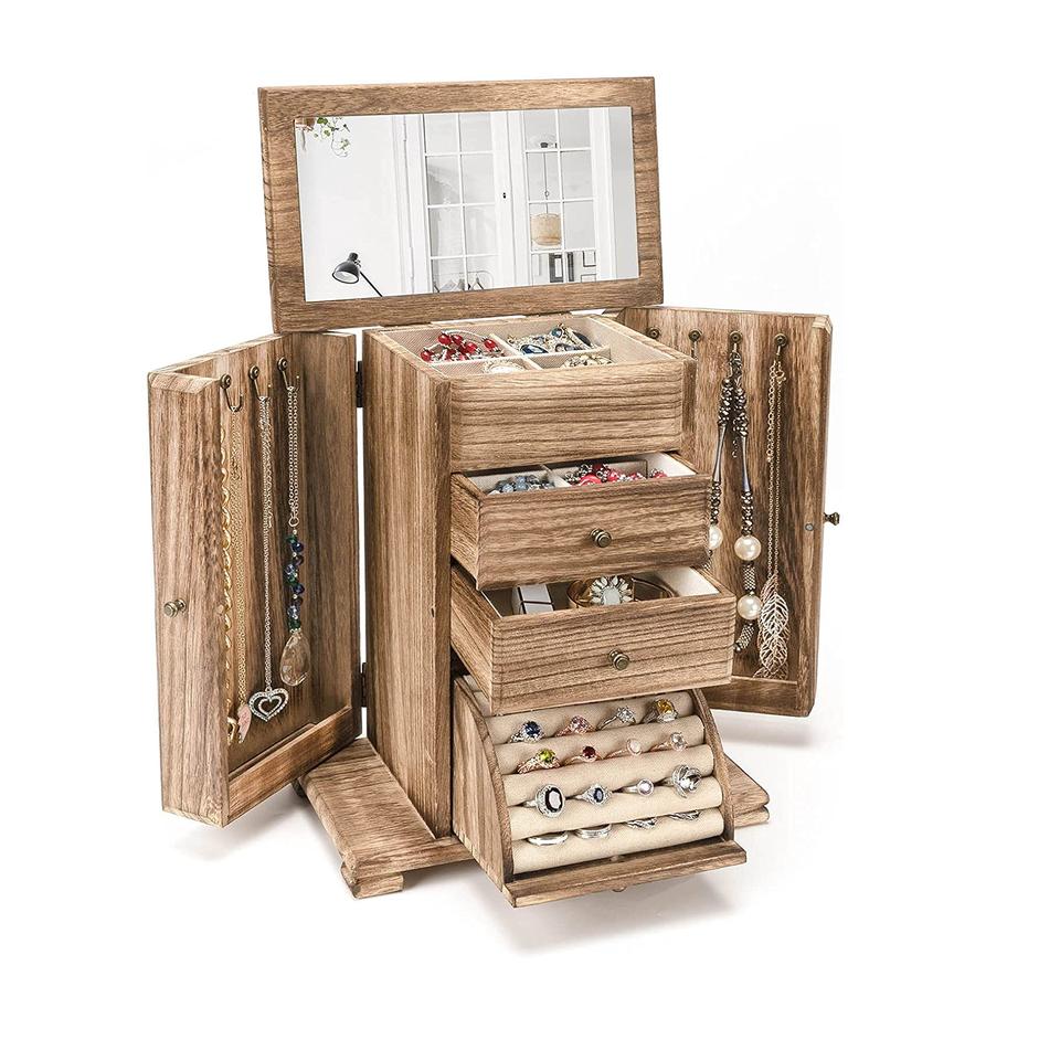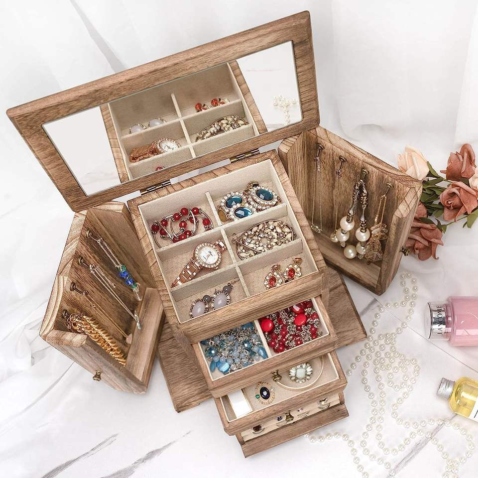 Jewelry Box for Women, Rustic Wooden Jewelry Boxes & Organizers with Mirror, 4 Layer Jewelry Organizer Box Display for Rings