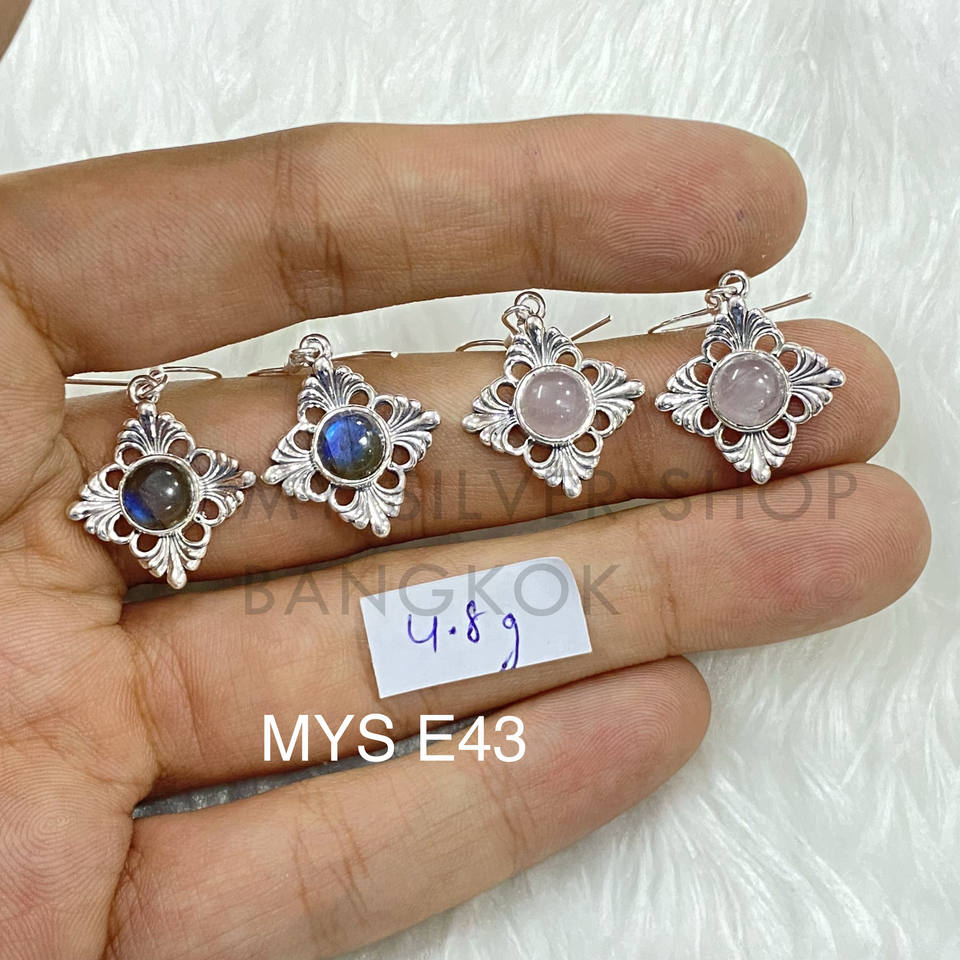 ต่างหูห่วงหินควอตซ์และลาบราดอไรต์ทำจากเงินโบราณดีไซน์สไตล์วินเทจยอดนิยม