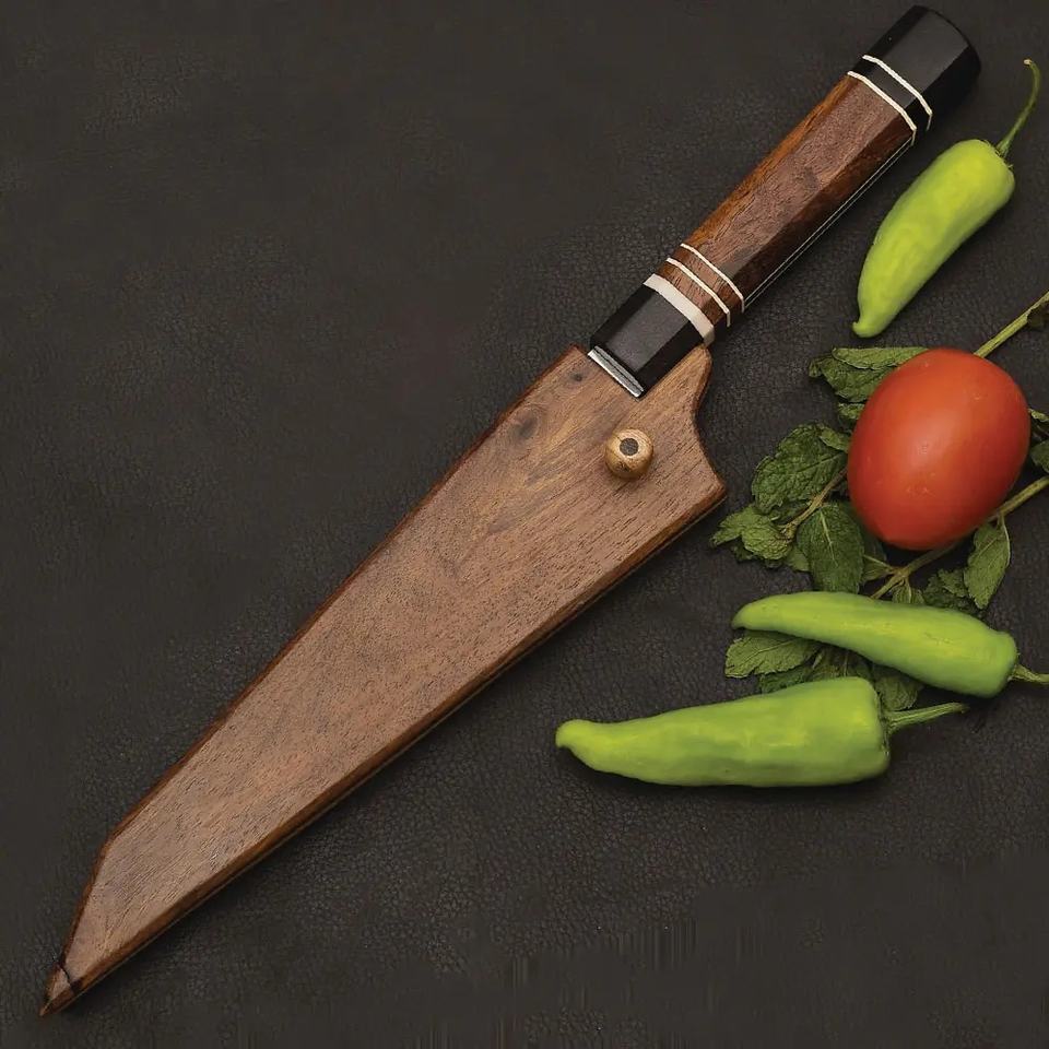 มีดเชฟเหล็กกล้าคาร์บอนทำมือ Jexmoo ขนาด 8 นิ้ว ด้ามไม้ ปลอกหนัง ของขวัญสำหรับเชฟ