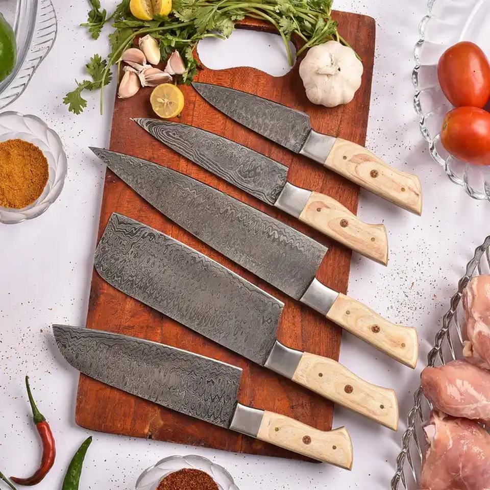 Jexmoo ชุดมีดเชฟเหล็กดามัสกัสทำด้วยมือ5ชิ้นเป็นมิตรกับสิ่งแวดล้อมเครื่องล้างจานปลอดภัยมีดด้ามไม้ในครัวแบบมืออาชีพ