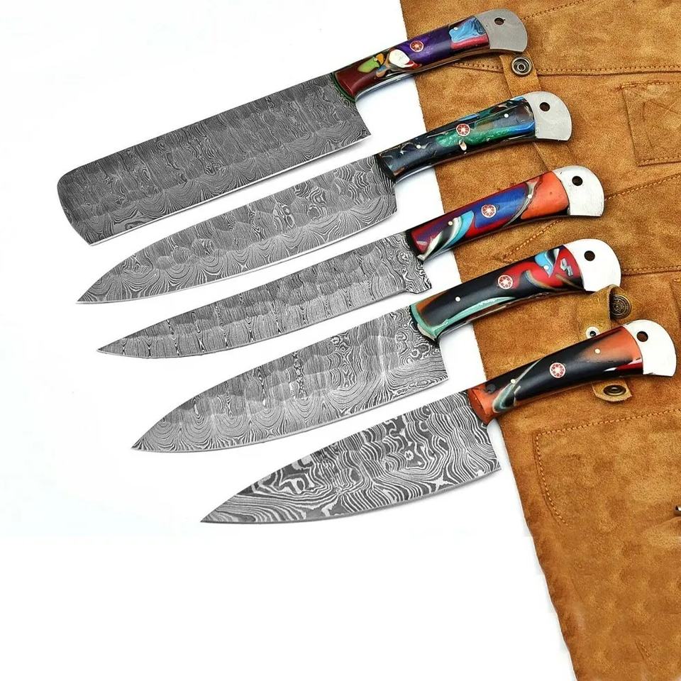Jexmoo ชุดมีดเชฟเหล็กดามัสกัสทำด้วยมือแบบกำหนดเอง5ชิ้นมีดทำครัวมืออาชีพพร้อมที่จับไม้ของขวัญสำหรับพ่อครัว