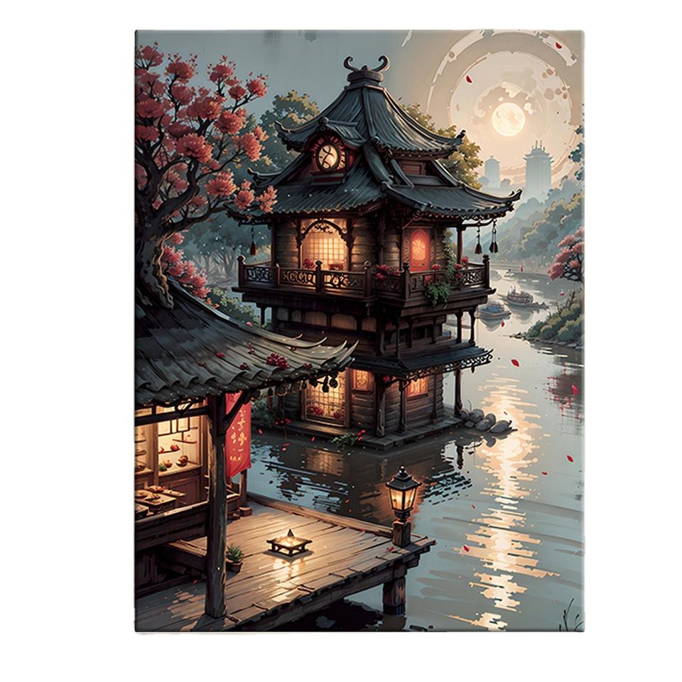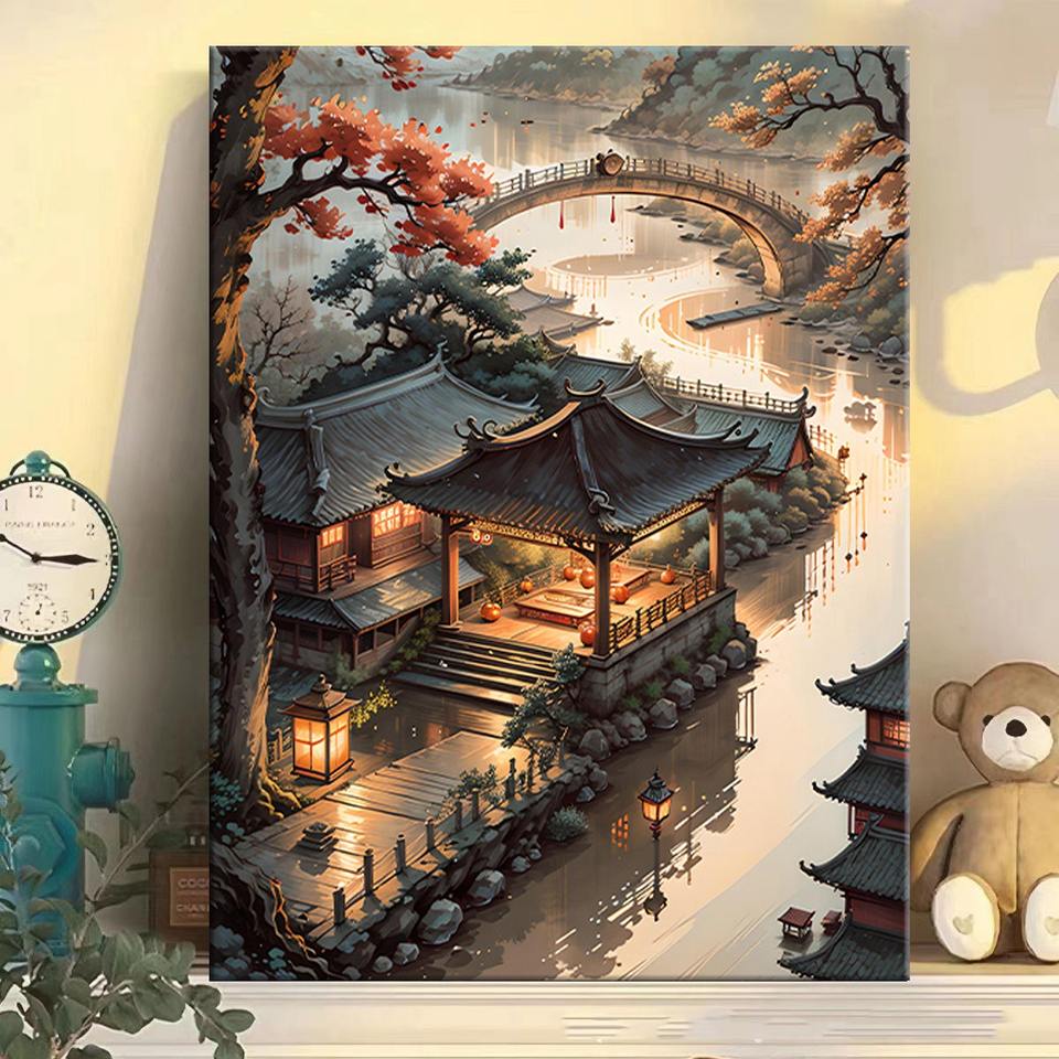 Jiangnan ภาพวาดสีน้ำมันดิจิตอลสไตล์สถาปัตยกรรมสไตล์โบราณ, ภาพวาดสีน้ำมันวาดด้วยมือสำหรับตกแต่ง