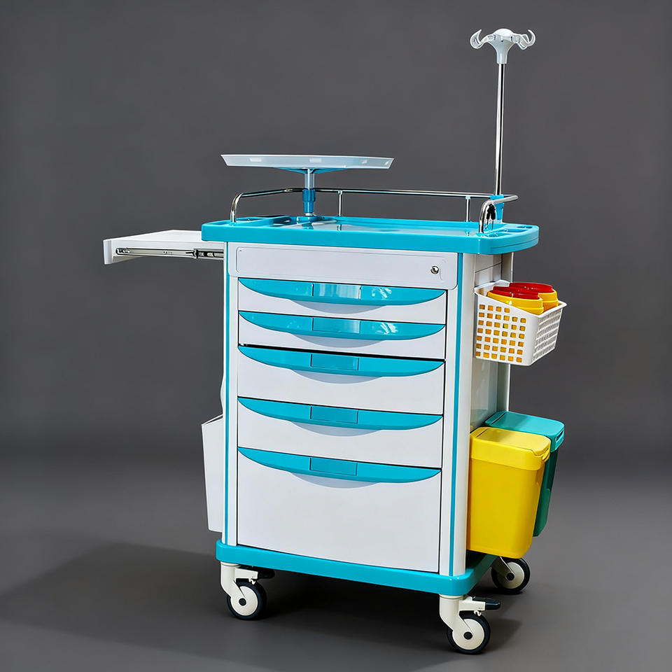 รถเข็นฉุกเฉินเจียงซู พลาสติก ABS 5 ลิ้นชัก ล้อเงียบ ล็อคกลาง ใช้ในโรงพยาบาลและคลินิก