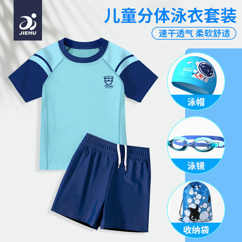 ชุดว่ายน้ำเด็ก Jiehu แบบสองชิ้น แห้งเร็ว UPF50+ คอกลม ผลิตจากโพลีเอสเตอร์ สำหรับเด็กอายุ 2-10 ปี