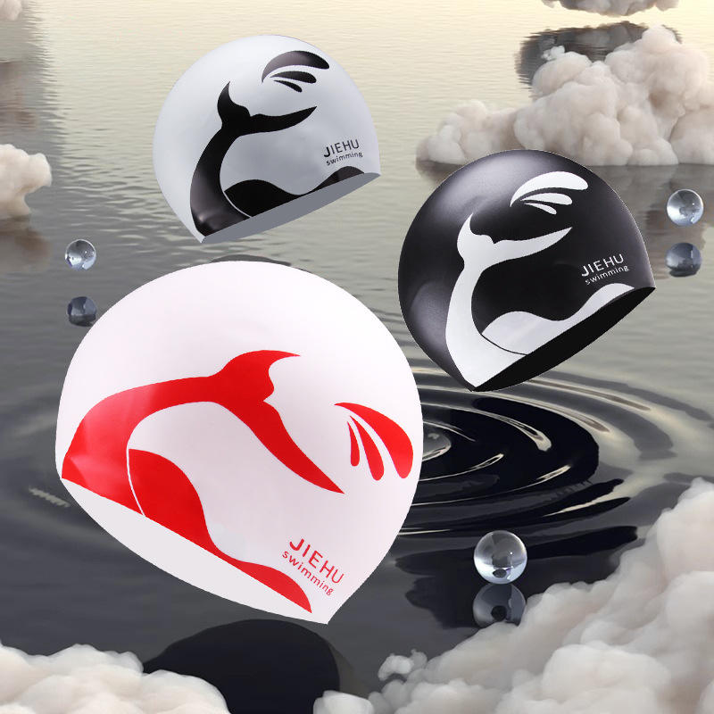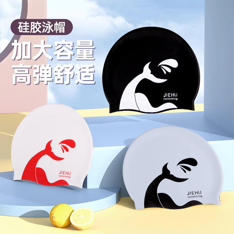 หมวกว่ายน้ำซิลิโคน Jiehu ไซส์ใหญ่ ยืดหยุ่นได้ สำหรับผู้ใหญ่ ชาย หญิง ผมยาว หมวกดำน้ำลายพิมพ์
