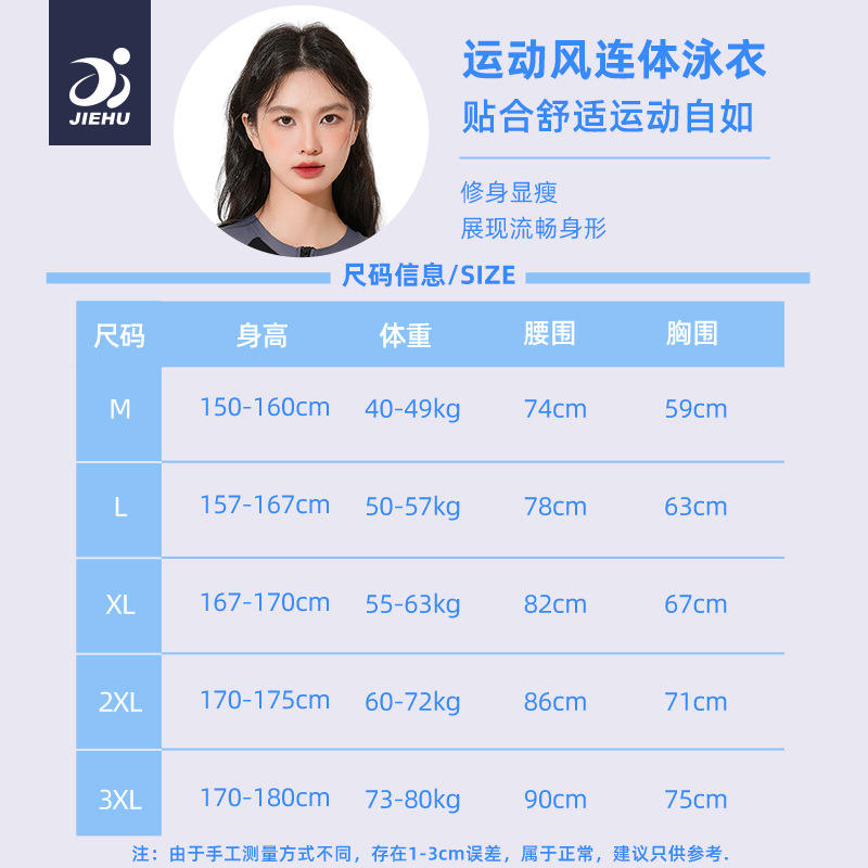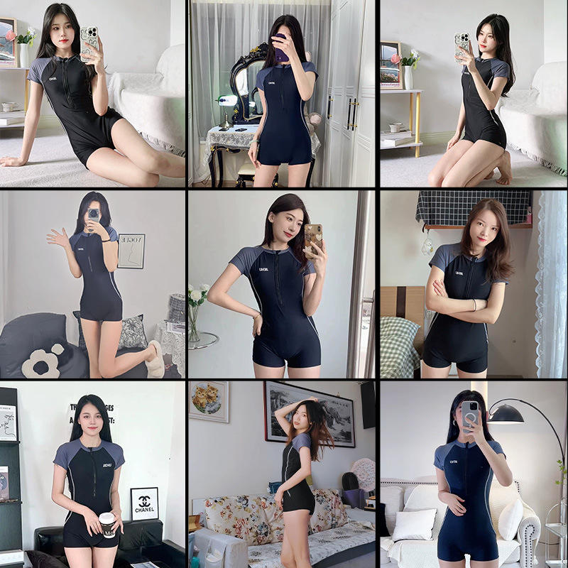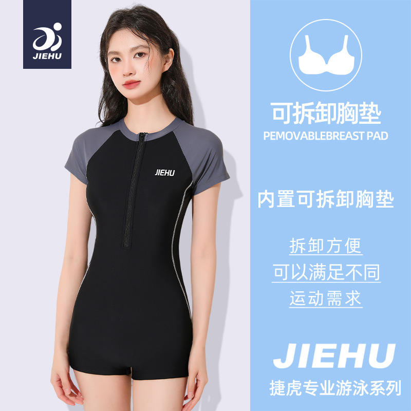 ชุดว่ายน้ำวันพีซสำหรับผู้หญิงเจียหูสีดำสีเทาคอกลมแขนสั้นชุดว่ายน้ำซิปด้านหน้าสำหรับว่ายน้ำและกีฬาทางน้ำ
