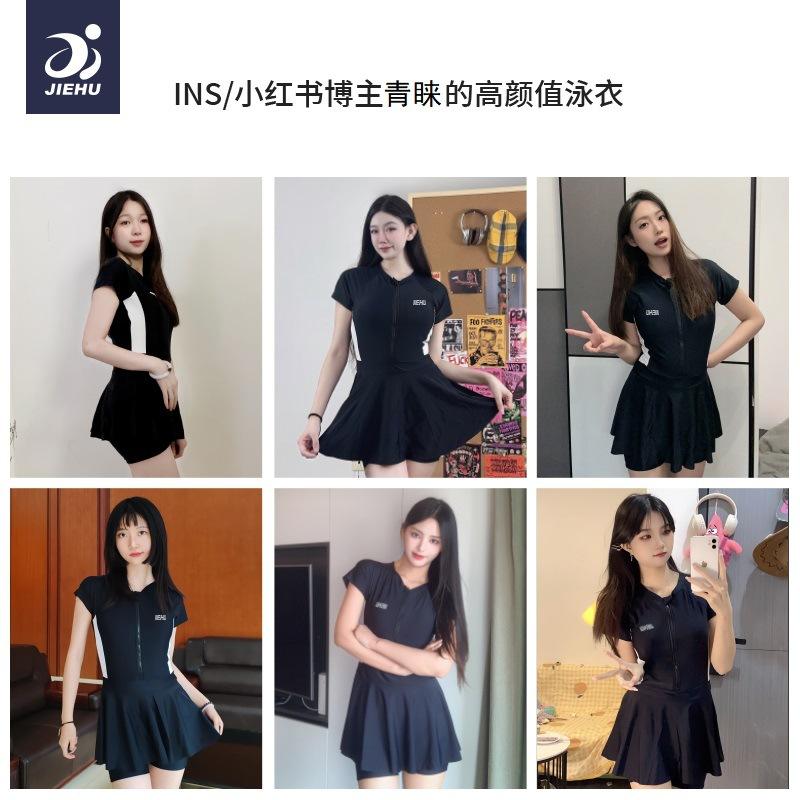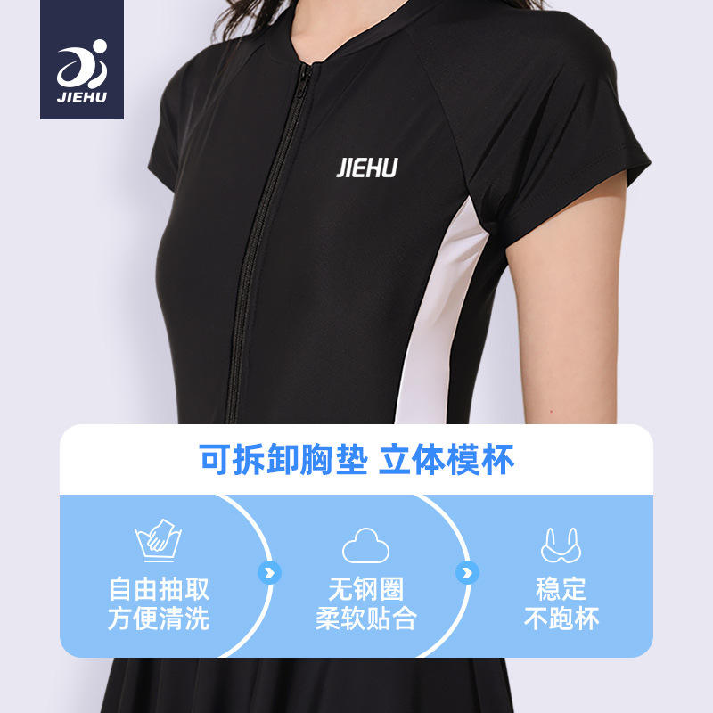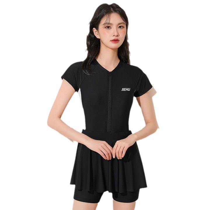Jiehu ชุดว่ายน้ำชิ้นเดียวสำหรับผู้หญิงชุดว่ายน้ำคอวีสีดำสีทึบสำหรับฟิตเนสว่ายน้ำกีฬาทางน้ำสำหรับผู้ใหญ่ขนาด M