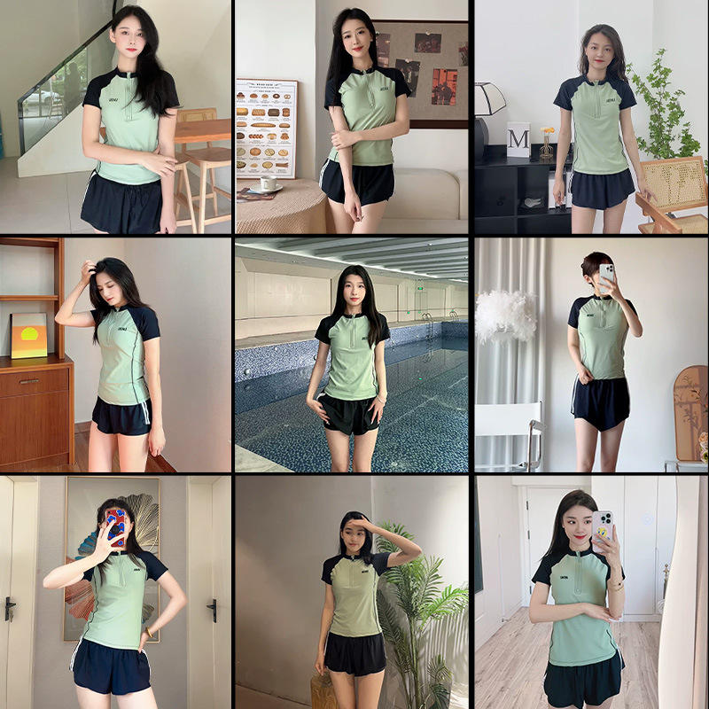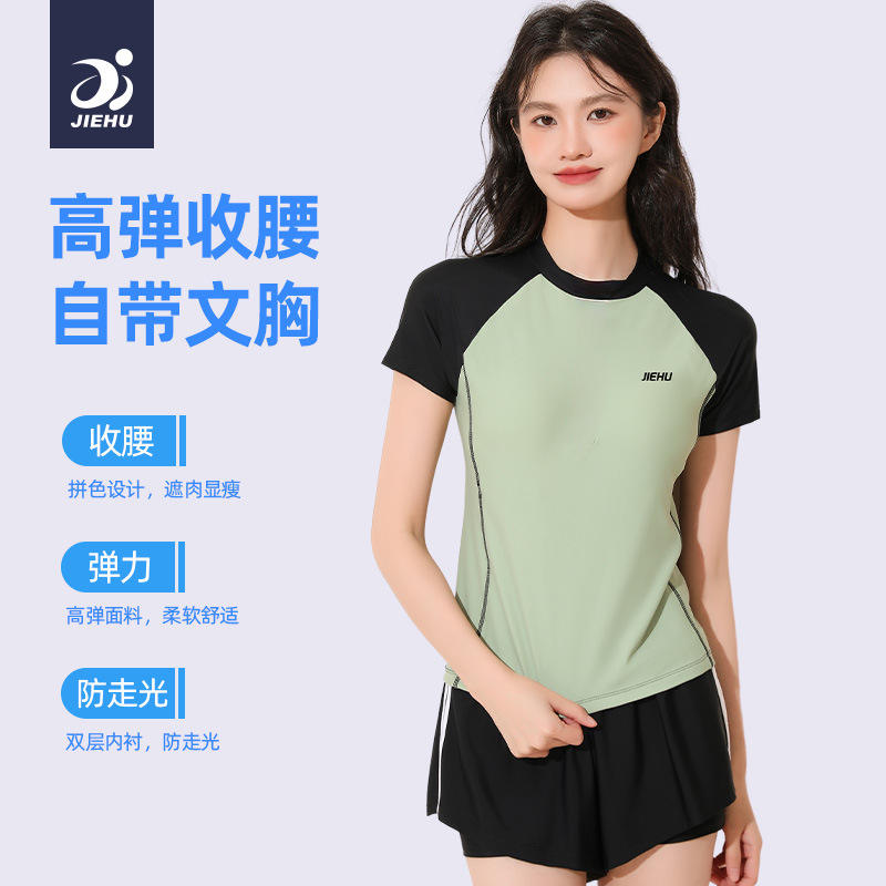 ชุดว่ายน้ำผู้หญิงเจียหูพร้อมกางเกงขาสั้น UPF50+ คอกลม ดีไซน์สปอร์ตสำหรับว่ายน้ำ วิ่ง ลุยน้ำ สำหรับผู้ใหญ่ ไซส์ S M L
