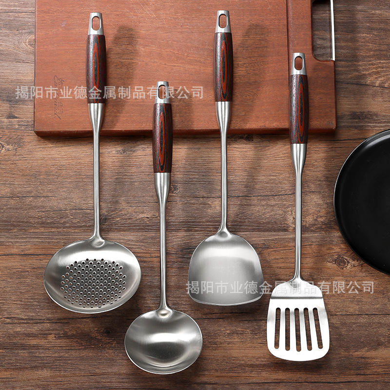 ชุดอุปกรณ์ทำครัวสแตนเลส 4 ชิ้น ยี่ห้อเจียหยาง ทนความร้อน พร้อมด้ามจับไม้พะยูง ประกอบด้วยตะหลิว ทัพพี ตะกร้อตัก และช้อนตัก