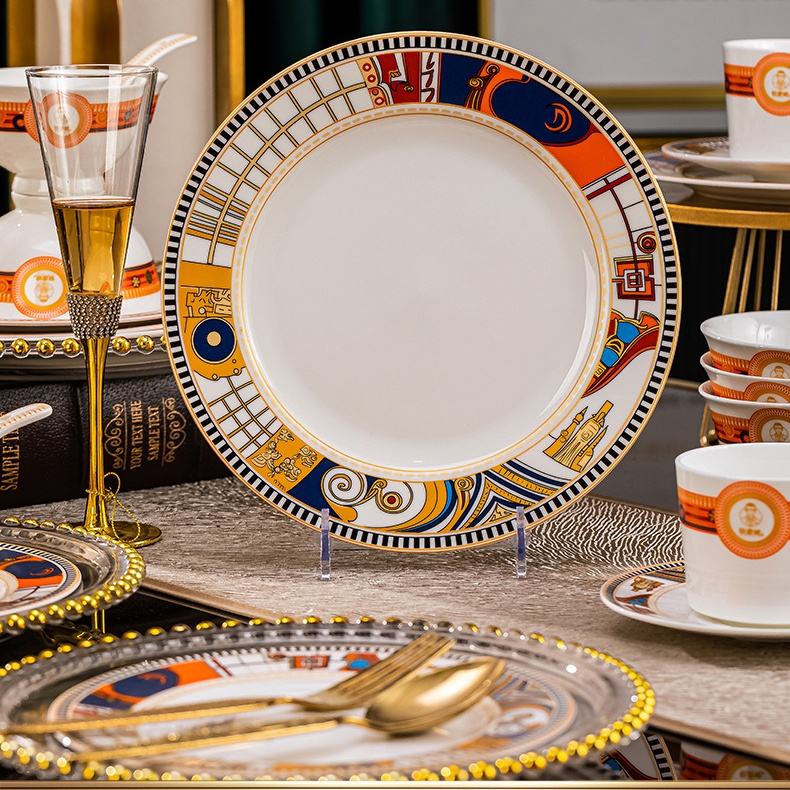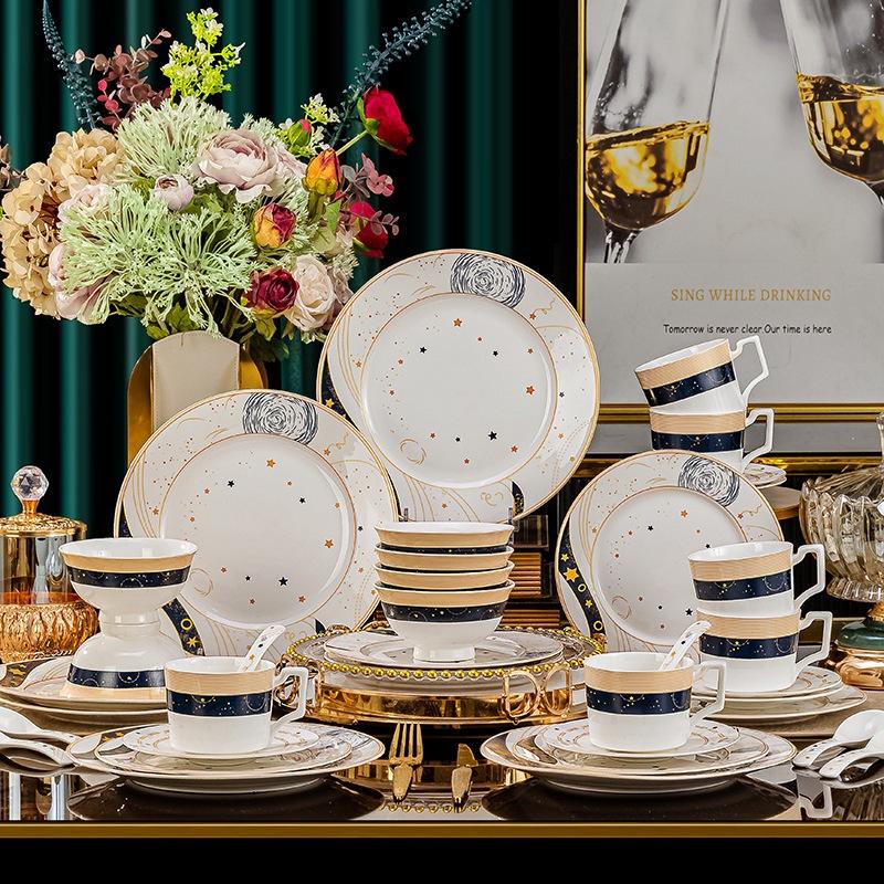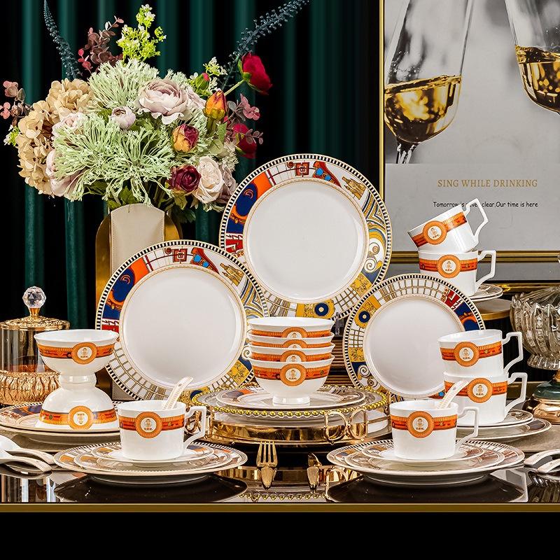 ชุดเครื่องครัวเซรามิกสไตล์ยุโรปจากเมืองจิ่งเต๋อเจิ้น ดีไซน์หรูหราเบาๆ ประกอบด้วยชามสำหรับใช้ในครัวเรือน ตะเกียบขอบทอง สำหรับใช้ในบ้าน