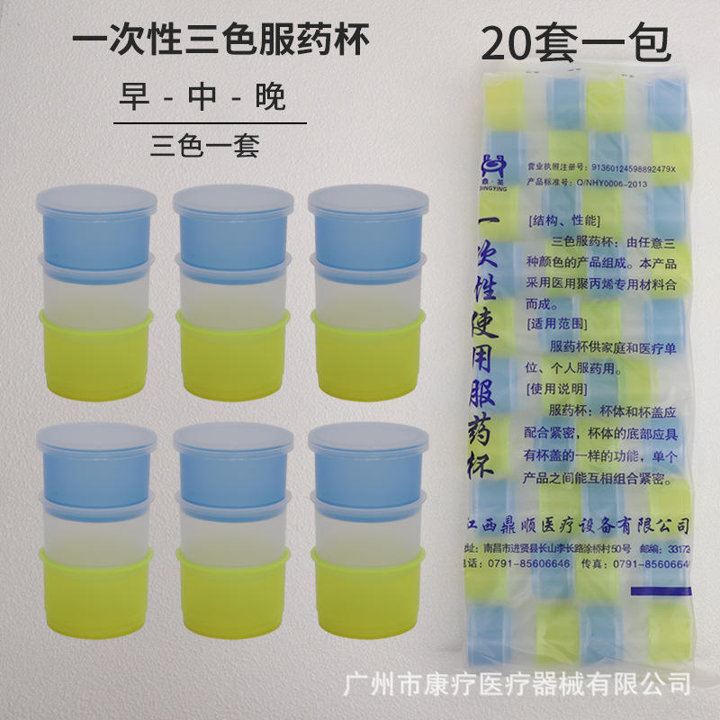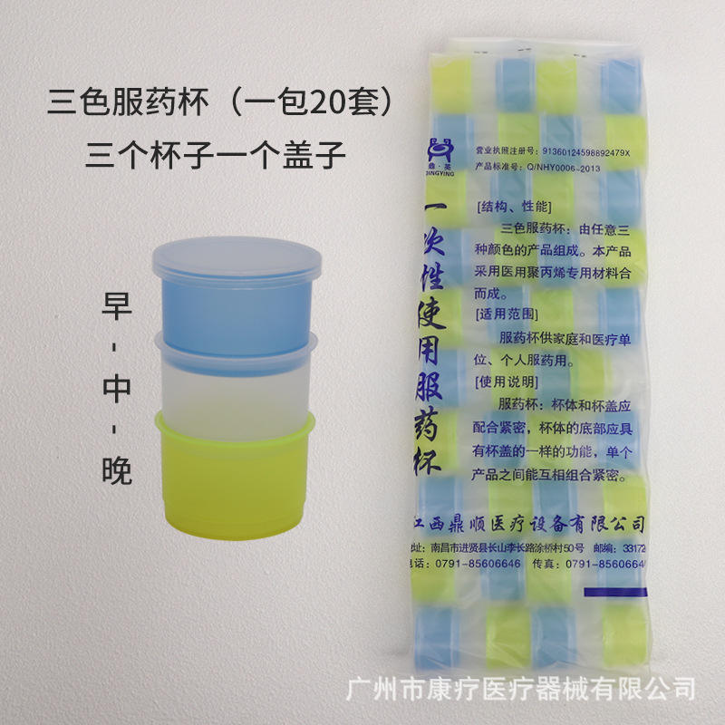 ถ้วยยาแบบใช้แล้วทิ้งสามสีพร้อมฝาปิด ยี่ห้อ Jingying ชุด 20 ชิ้น แบบพกพา สำหรับยาชนิดรับประทาน