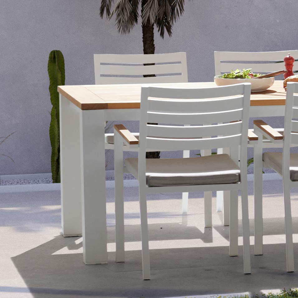 คำอธิบาย:ชุดโต๊ะอาหารไม้สักพร้อมเก้าอี้หุ้มและผิวสีขาว