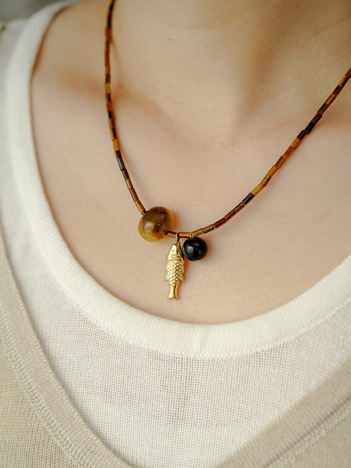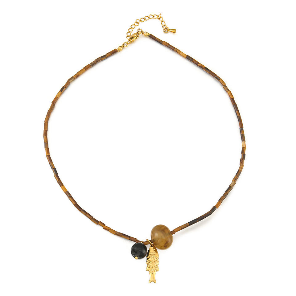 สร้อยคอโชคเกอร์ประดับลูกปัดไทเกอร์อายจาก JoJo Jewelry หินธรรมชาติ ชุบทอง 14K จี้รูปปลาทำมือ ปรับขนาดได้ สไตล์โบฮีเมียน เหมาะสำหรับงานปาร์ตี้
