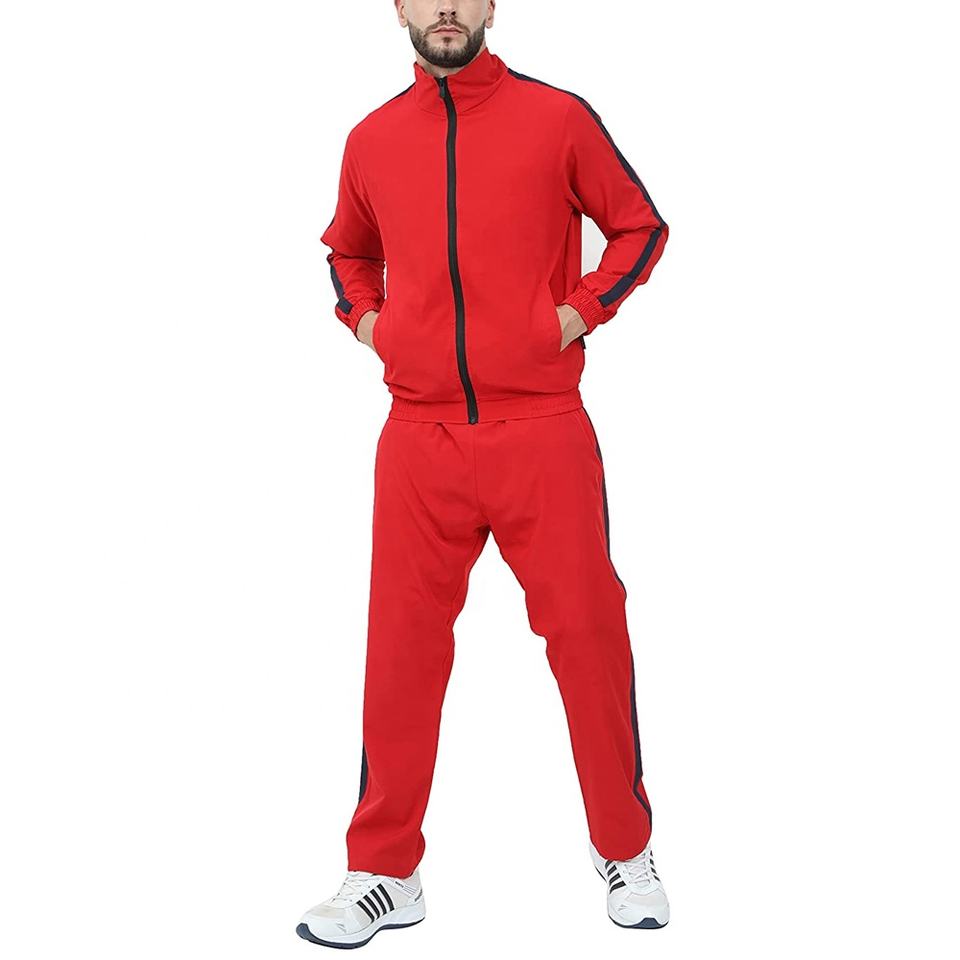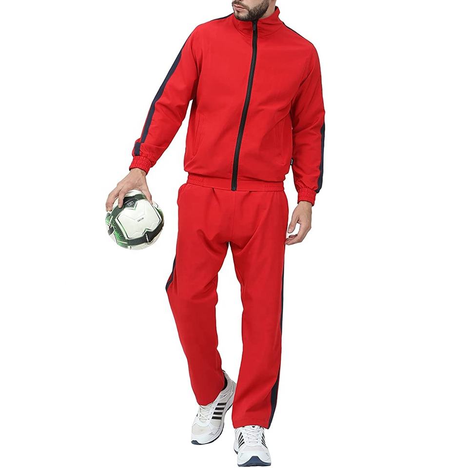 ชุดวอร์มลำลองสีแดงแบบมีซิปเต็มตัว ผลิตจากโพลีเอสเตอร์ พร้อมโลโก้สั่งทำพิเศษ สำหรับผู้ชาย เหมาะสำหรับใส่เล่นกีฬาและฝึกซ้อม ผลิตจากผ้าเทคฟลีซ