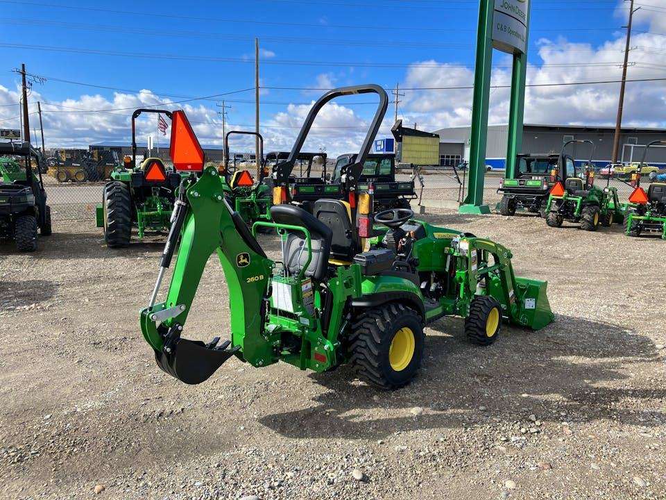 รถแทรกเตอร์ตัดหญ้า John Deere 260B พร้อมอุปกรณ์ตักดินด้านหน้าและอุปกรณ์ขุดดินด้านหลังสำหรับขาย พร้อมจัดส่งรวดเร็วไปยังสหรัฐอเมริกา/ยุโรป/เอเชีย