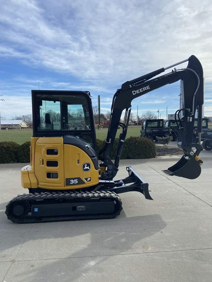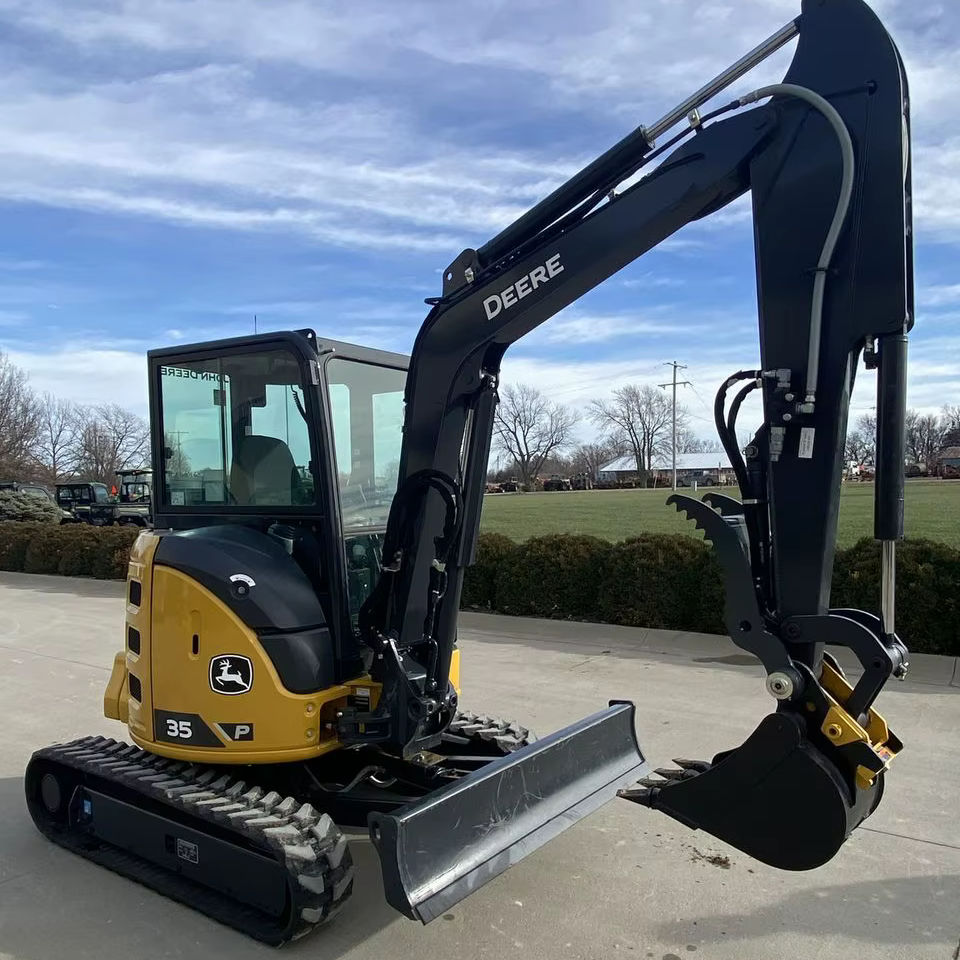 รถขุดขนาดเล็ก Johnn Deerre 35 P พร้อมห้องโดยสาร/ระบบทำความร้อน/ระบบปรับอากาศ บูมยาว ถ่วงน้ำหนักด้านหลัง ใบมีดไฮดรอลิกด้านหน้า ถังขนาด 18 ลิตร และถังทำความสะอาดขนาด 34 ลิตร