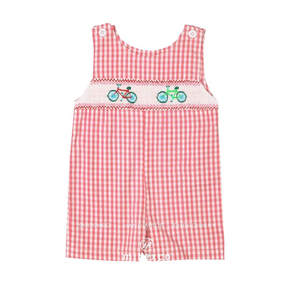 Jon Jon Shortall Romper for Baby Boys | Blue Gingham Smocked Smocked Bicycle | Summer Shortall Outfit ODM Woven