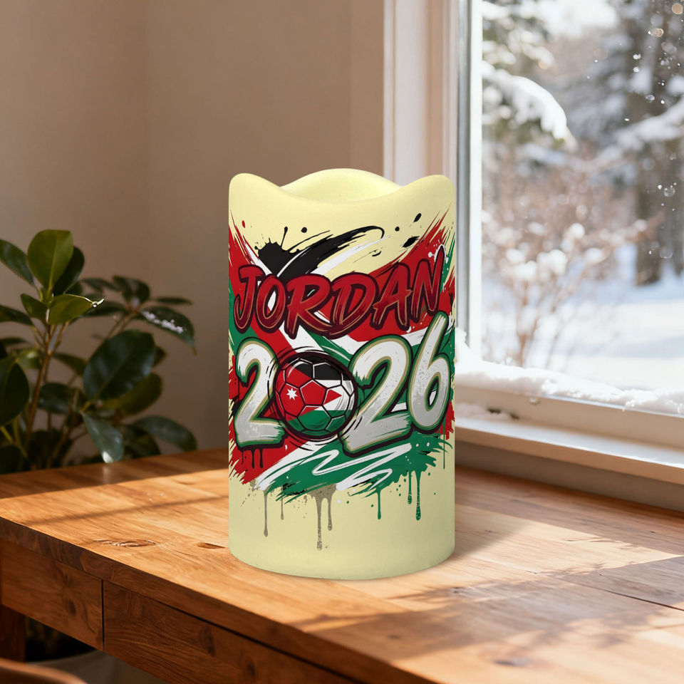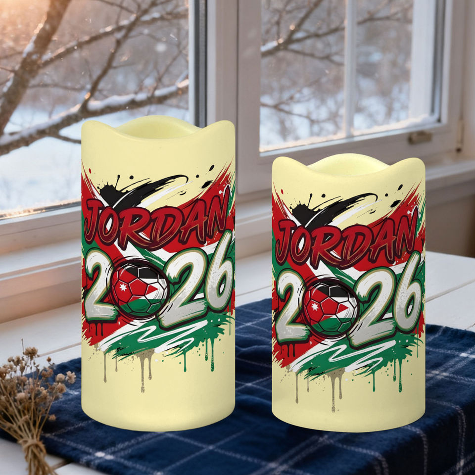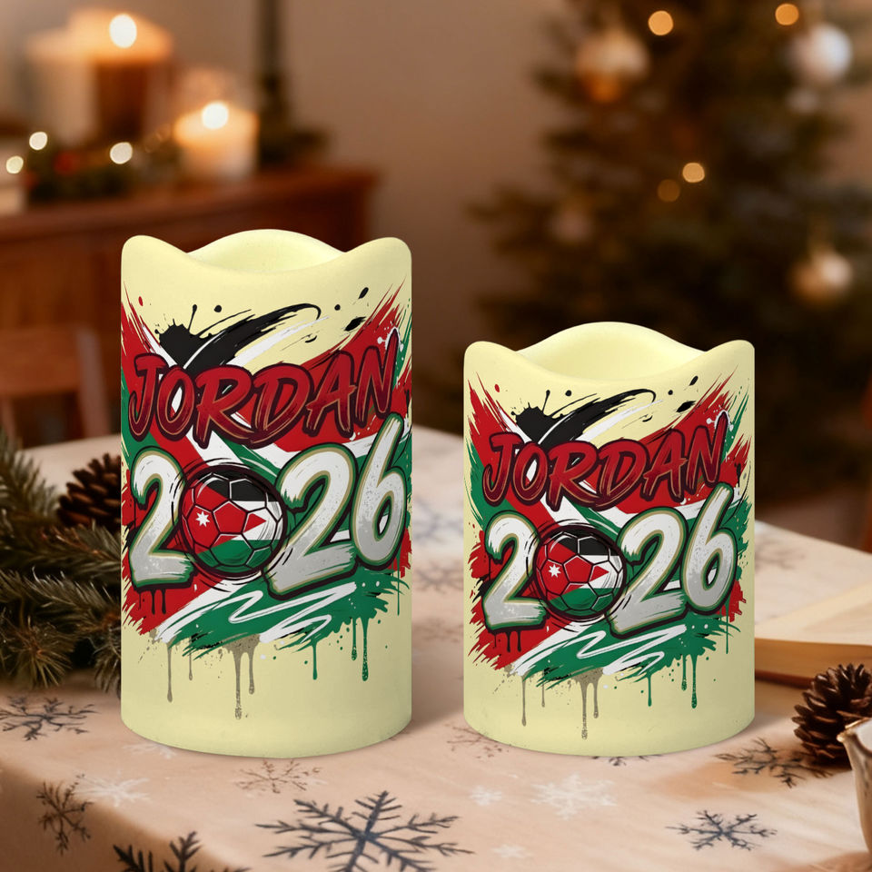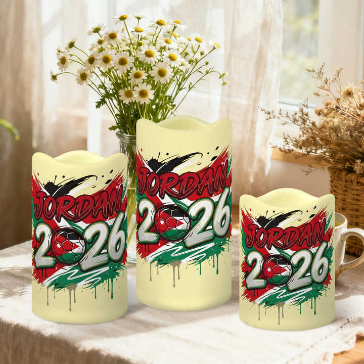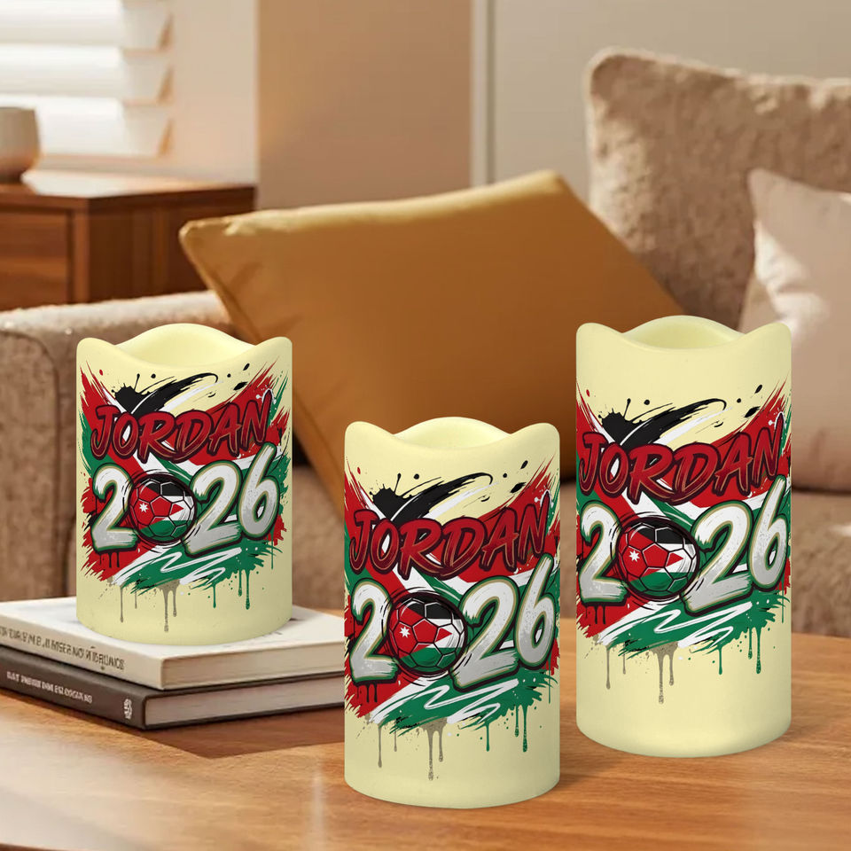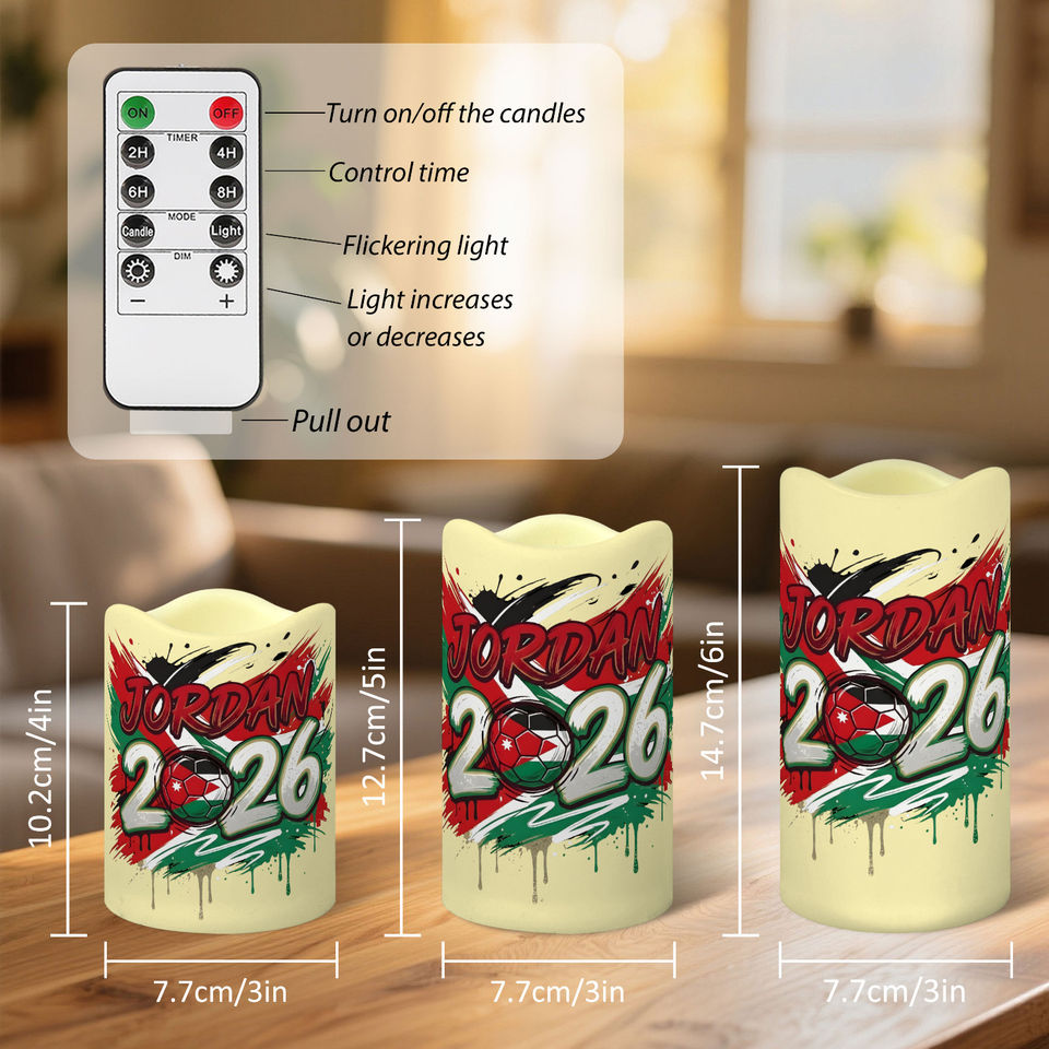 ชุดเทียน LED ตกแต่งสำหรับแฟนฟุตบอลจอร์แดน 3 ชิ้น ขอบหยัก ลายธีมการแข่งขันปี 2026 ไม่มีเปลวไฟ พร้อมรีโมท