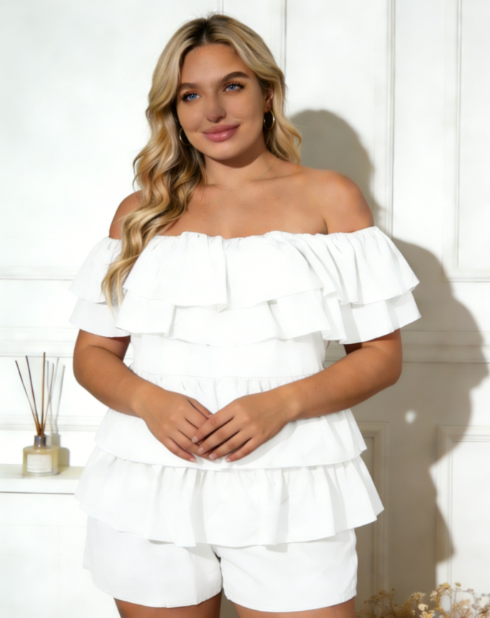 จอยอินสปริง ชุดเดรสสีขาวแบบเปิดไหล่ แต่งระบายเป็นชั้นๆ สำหรับผู้หญิงไซส์พลัส เหมาะสำหรับฤดูร้อน แห้งเร็ว ผ้าถัก ทรงปกติ แขนสั้น