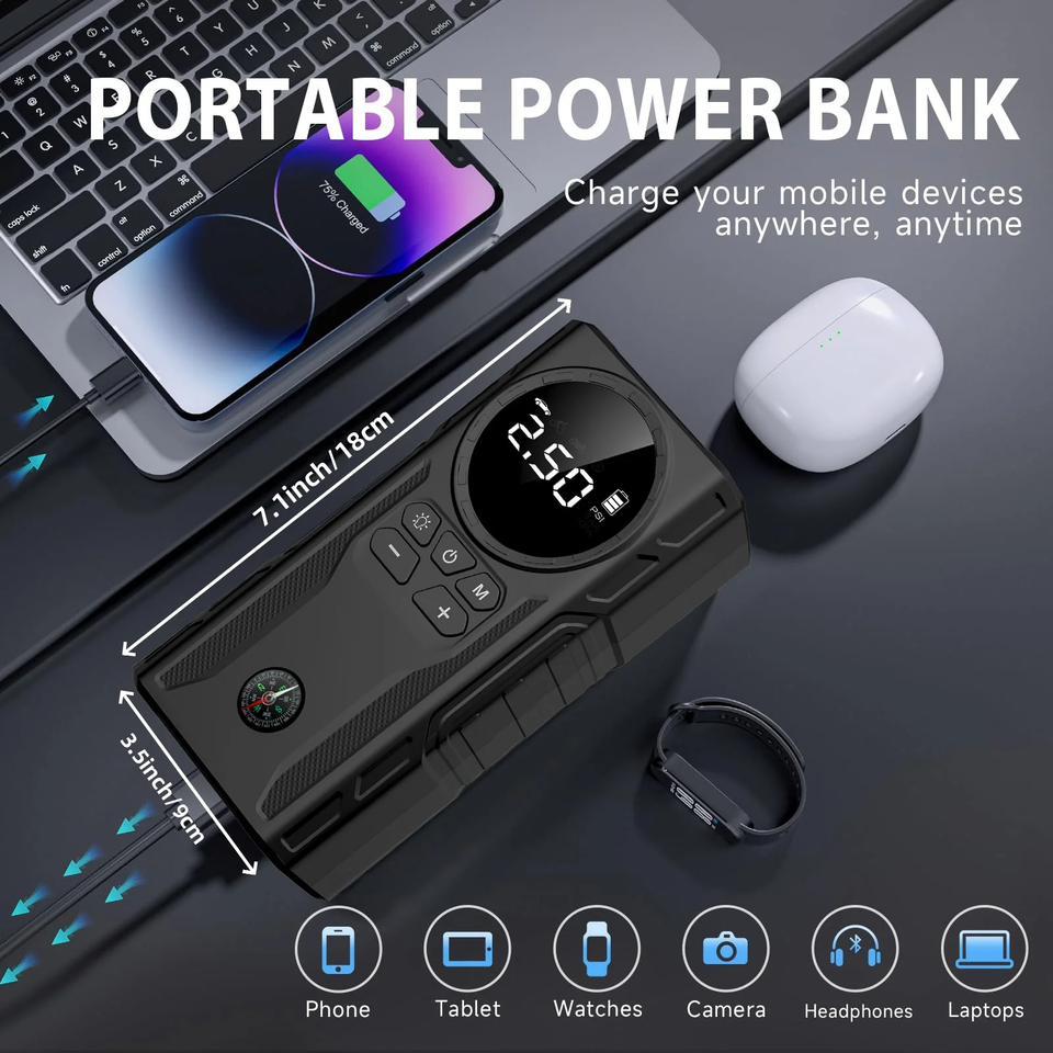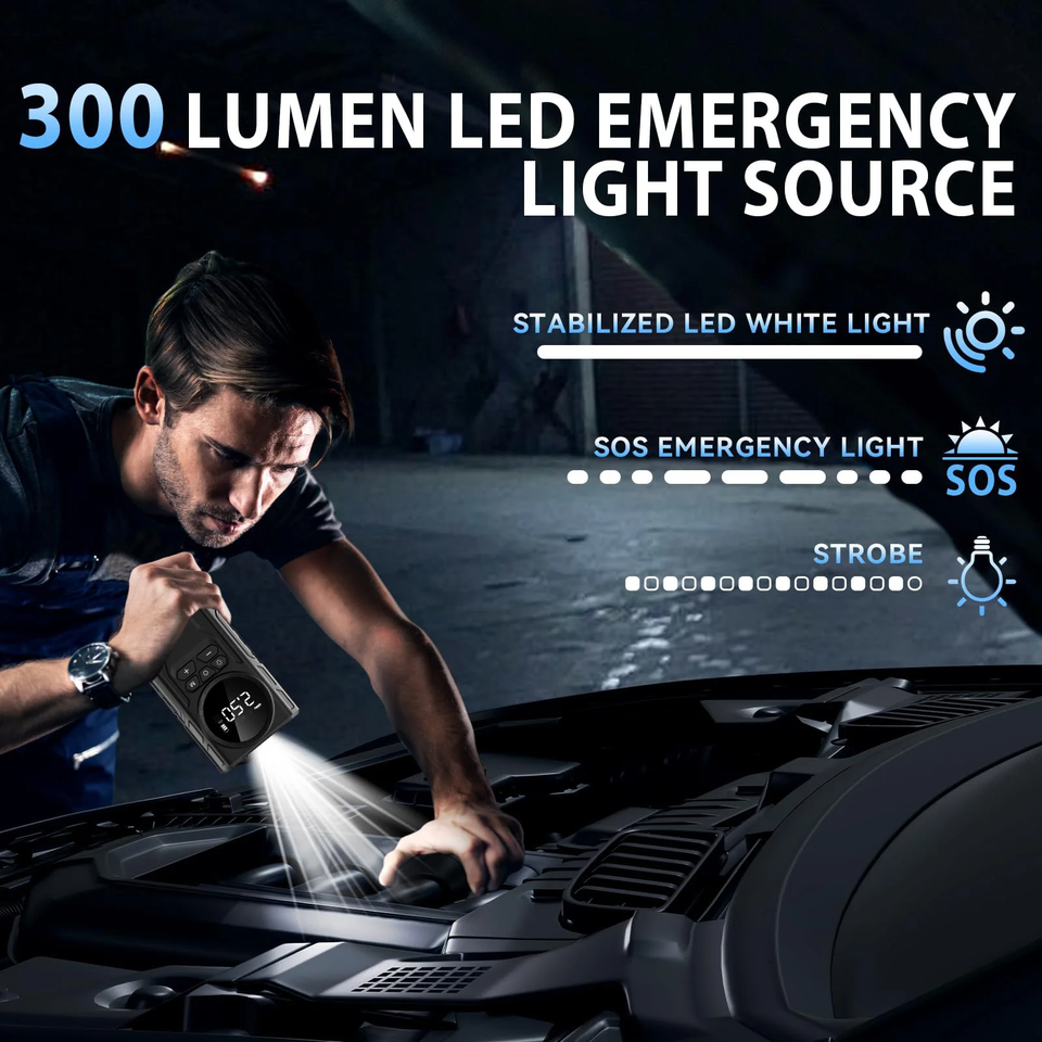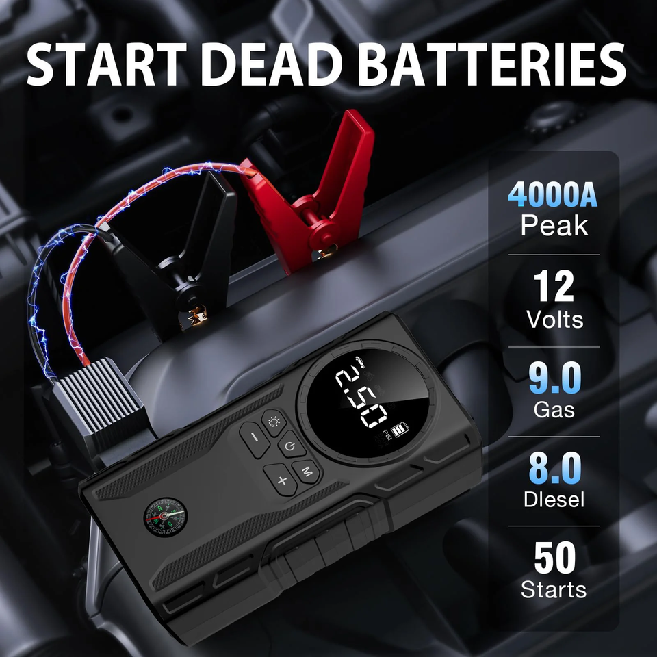 เครื่องช่วยสตาร์ทรถยนต์พร้อมเครื่องอัดอากาศและหน้าจอ LED ดิจิตอล 4000A 150PSI แบบพกพา (9.0 นิ้ว สำหรับรถยนต์เบนซิน/8.0 ลิตร สำหรับรถยนต์ดีเซล) ผลิตในประเทศจีน