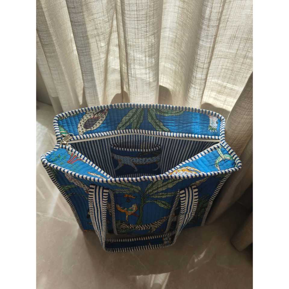 กระเป๋าโท้ทสไตล์โบฮีเมียน Jungle Joy สีฟ้าโอเชียน ขนาดกลาง ซิปกันน้ำ ปักลายเย็บมือ บุหนา ซับในโพลีเอสเตอร์