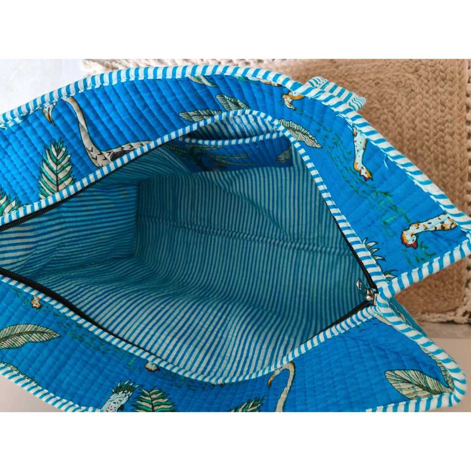 กระเป๋าโท้ทขนาดกลางผ้าฝ้ายรีไซเคิลสีฟ้าซีอานลายปักมือ Jungle Joy พร้อมซิปปิด ใช้ซ้ำได้ รีไซเคิลได้ เหมาะสำหรับใช้ในชีวิตประจำวัน ลายสัตว์