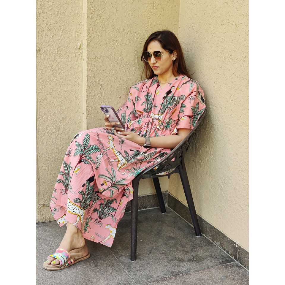 Jungle Joy Kaftan Women Peachy Pink Floor-Length V-neck Wrap Tie Dress Elegant Casual Draped Breathable Free (XS 6XL) Leisure