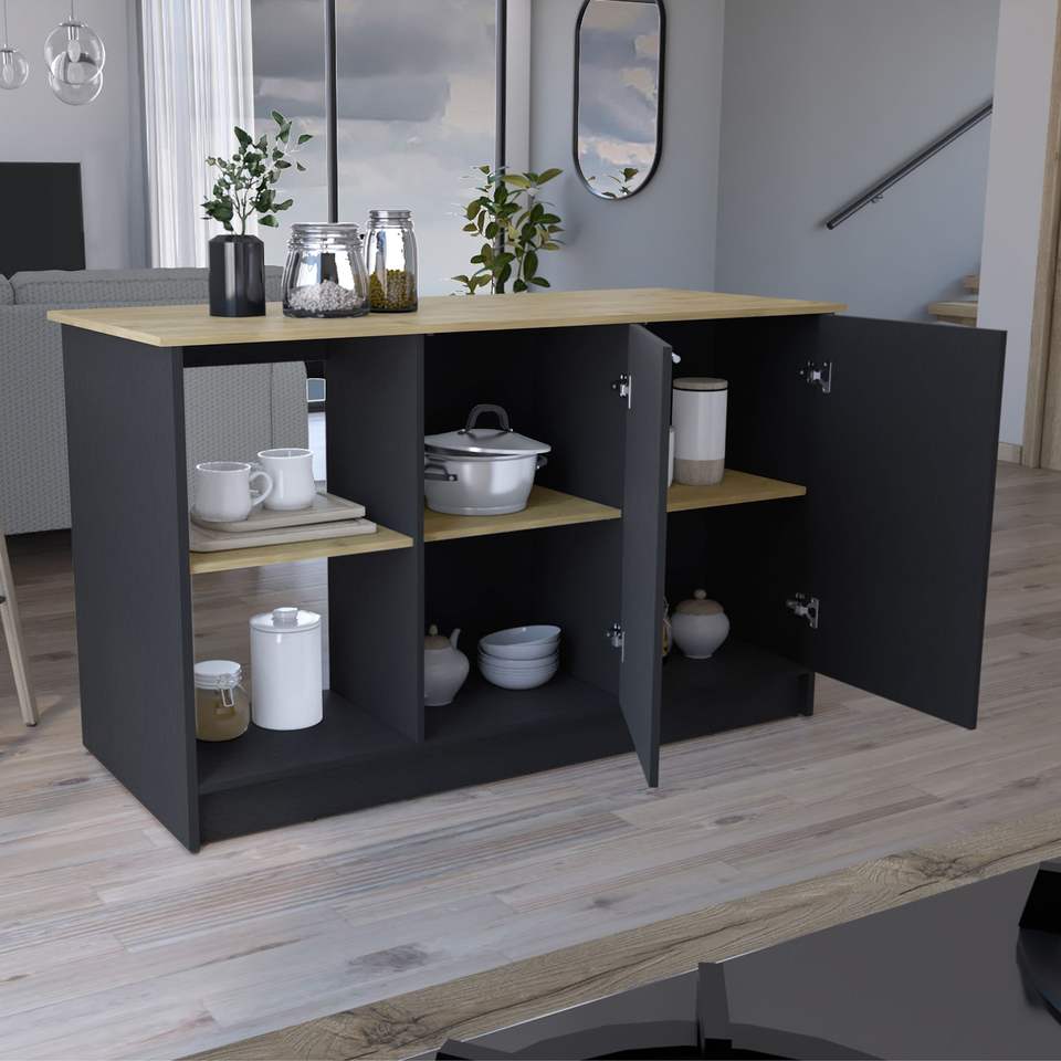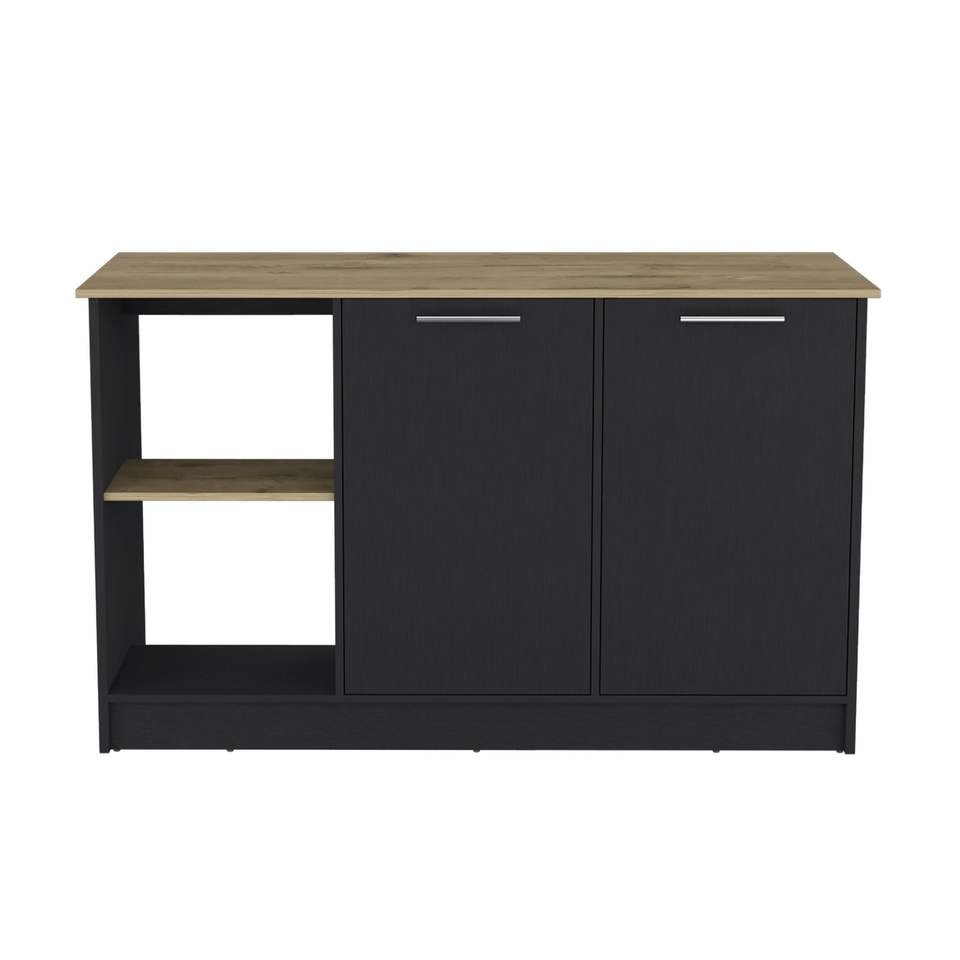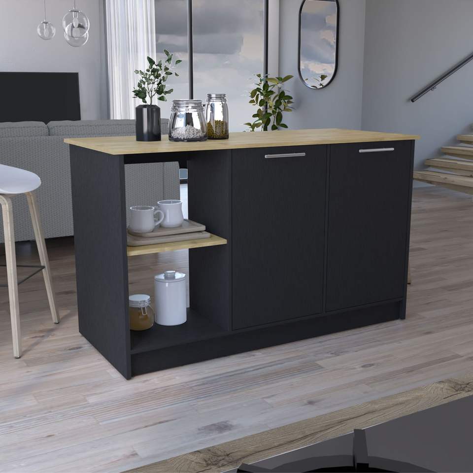 ชุดครัวแบบเกาะกลางพร้อมพื้นผิวด้านบนขนาดใหญ่ ตู้บานคู่ ชั้นวางแบบเปิด สีดำ/แมคคาเดเมีย ชุดครัวแบบเกาะกลางและรถเข็น