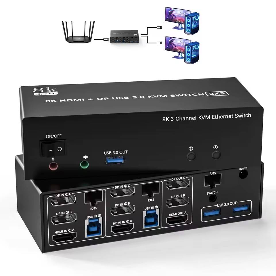 สวิตช์ Justlink DP HDMI2.1 สวิตช์ DP1.4 USB3.0 2x3 KVM สวิตช์เปลี่ยนสัญญาณ 8K 60Hz 4k 120Hz HDR Iron USB3.0 HDMI DP สวิตช์เปลี่ยนสัญญาณวิดีโอ