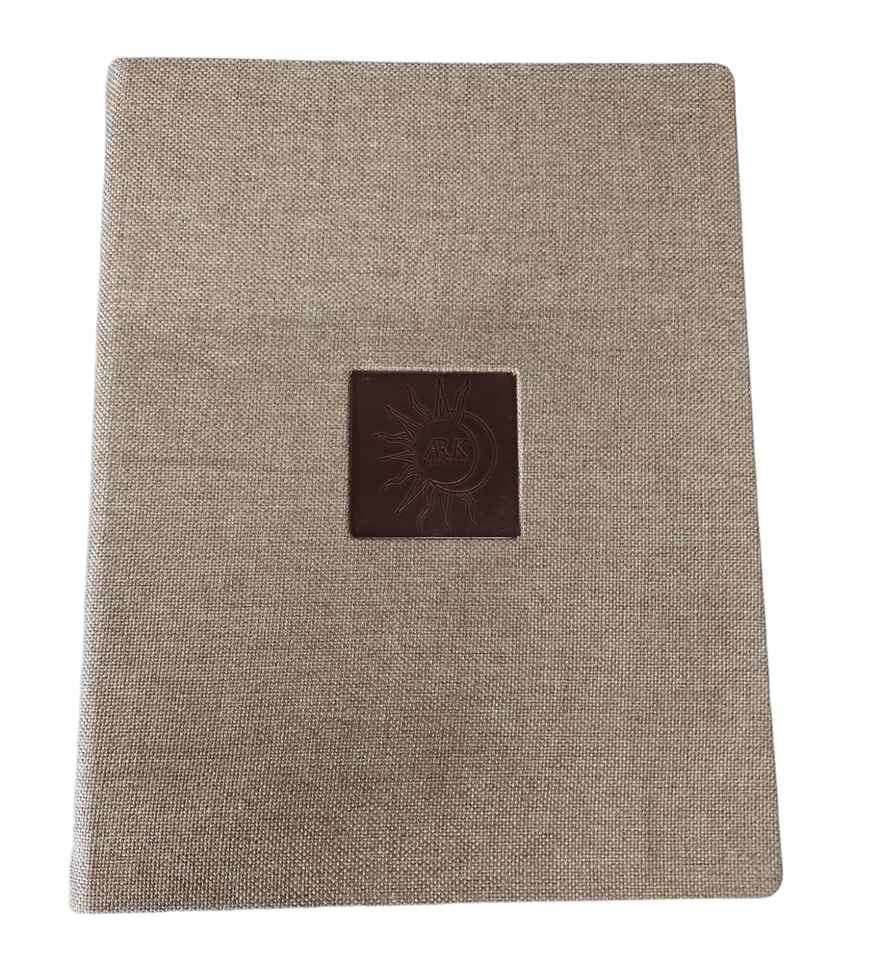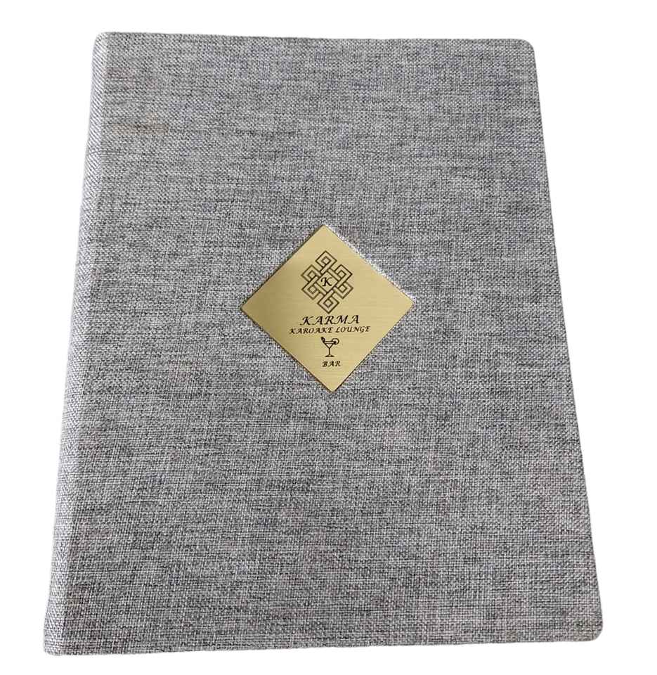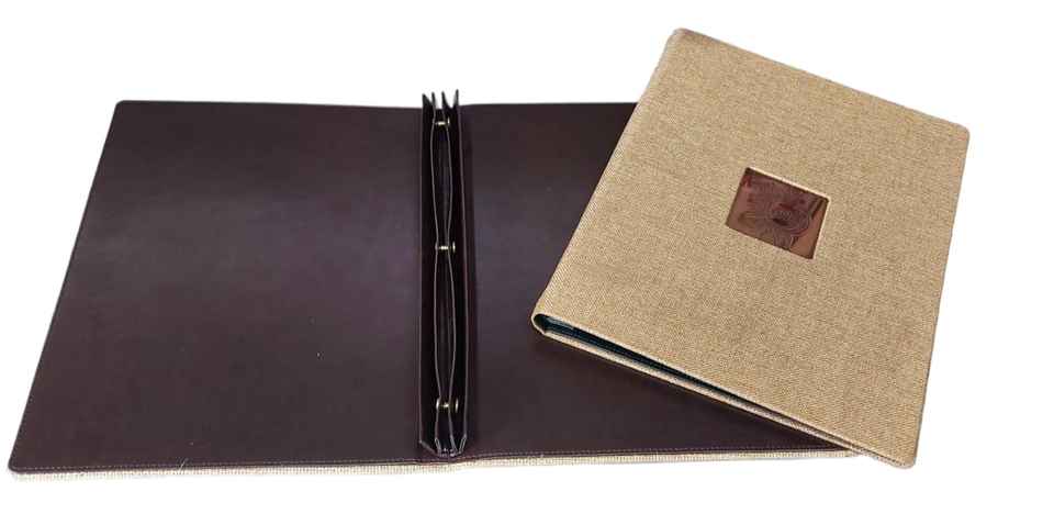 leatherette menu folder with nickel plated logo