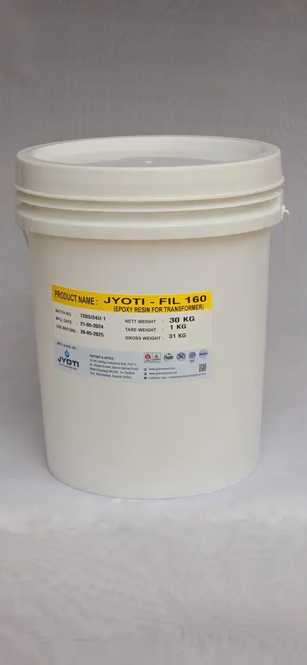 เรซิ่นอีพ็อกซี่ Jyoti FIL 160 สำหรับหม้อแปลงไฟฟ้า น้ำหนักสุทธิ 30 กก. เกรดสำหรับงานไฟฟ้า บรรจุในถังพลาสติกสีขาว บริษัทจโยติ เอ็นเตอร์ไพรส์