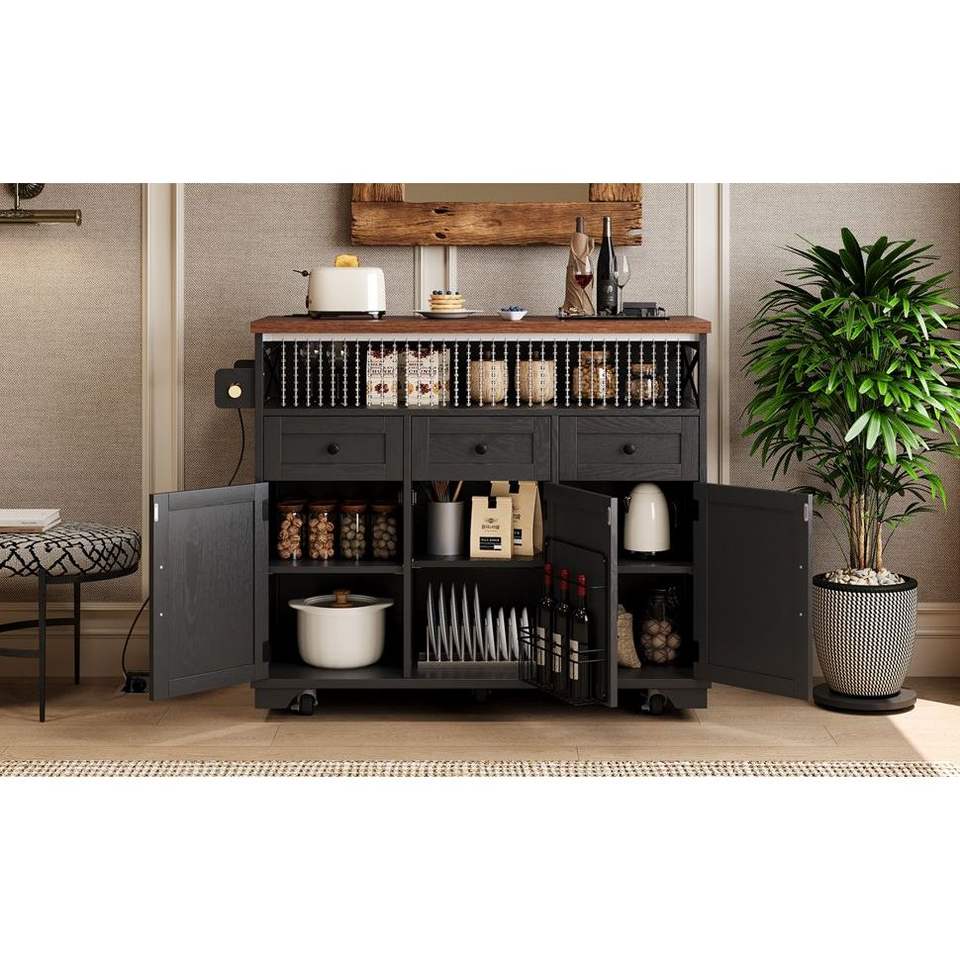 K & K 46.5 'สีดำสำหรับบ้านไร่, รถเข็นชาวเกาะ3ประตูชั้นเหล็ก3ลิ้นชักชั้นล้อเลื่อนม่านลูกปัดไฟฟ้าครัว