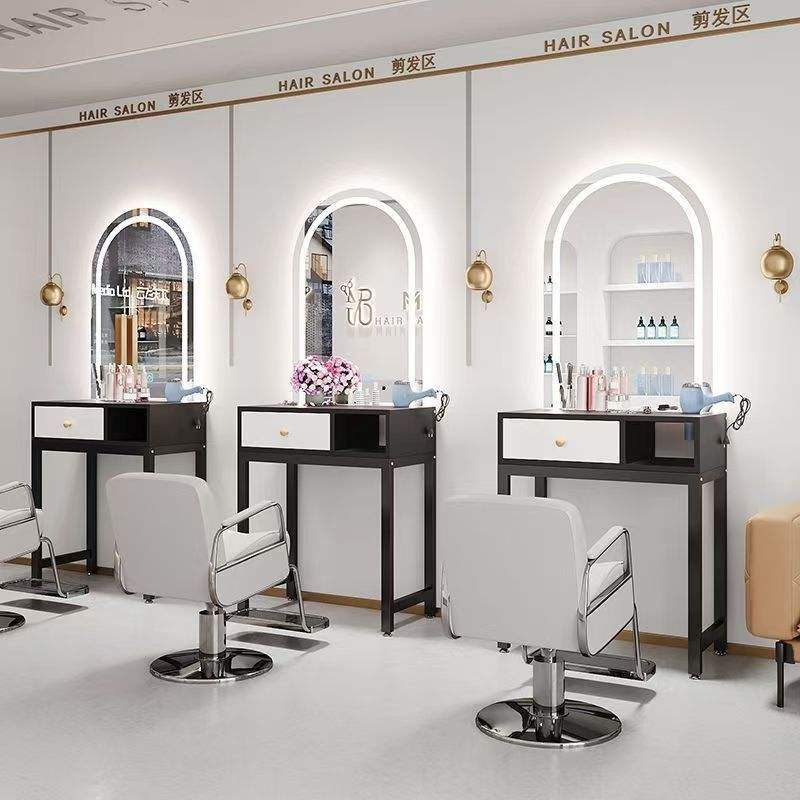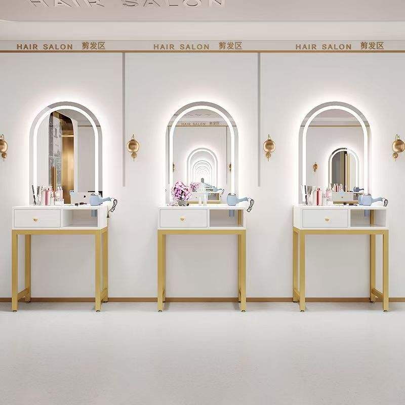 กระจกแต่งผม LED ยอดนิยมแบบไม่ต้องเจาะติดผนัง พร้อมขาตั้งสำหรับร้านทำผมโดยเฉพาะ โครงโต๊ะกระจกสำหรับร้านเสริมสวยและร้านทำผม