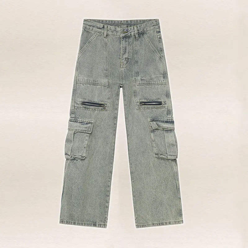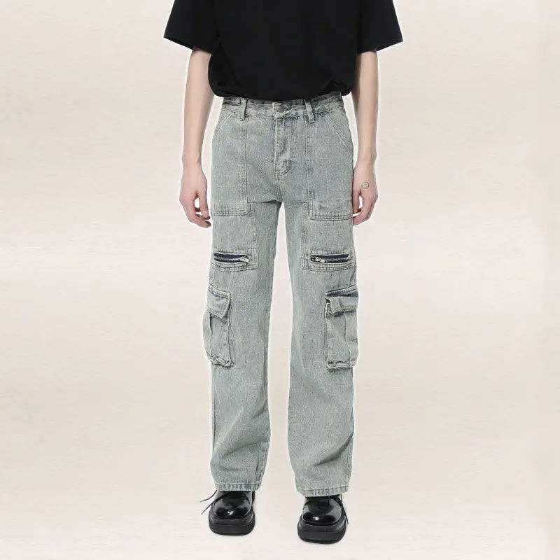 K- T กางเกงยีนส์ผู้ชาย, กางเกงยีนส์ขายาวตรงขากว้างผ้าฝ้ายพิมพ์ลายทรงหลวมสำหรับฤดูใบไม้ร่วง