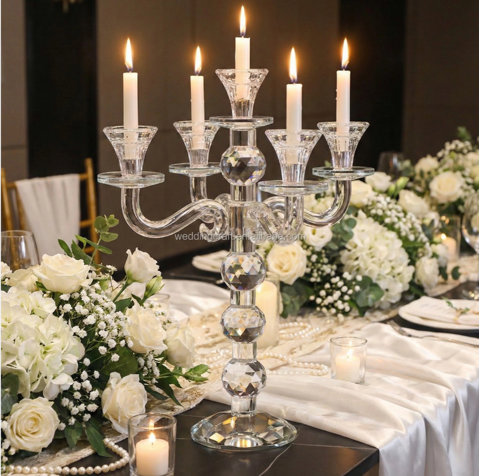 เชิงเทียนคริสตัลใส 5 แขน รุ่น K62 คุณภาพสูง สไตล์โมเดิร์น สำหรับงานแต่งงาน พร้อมฝาครอบแก้ว