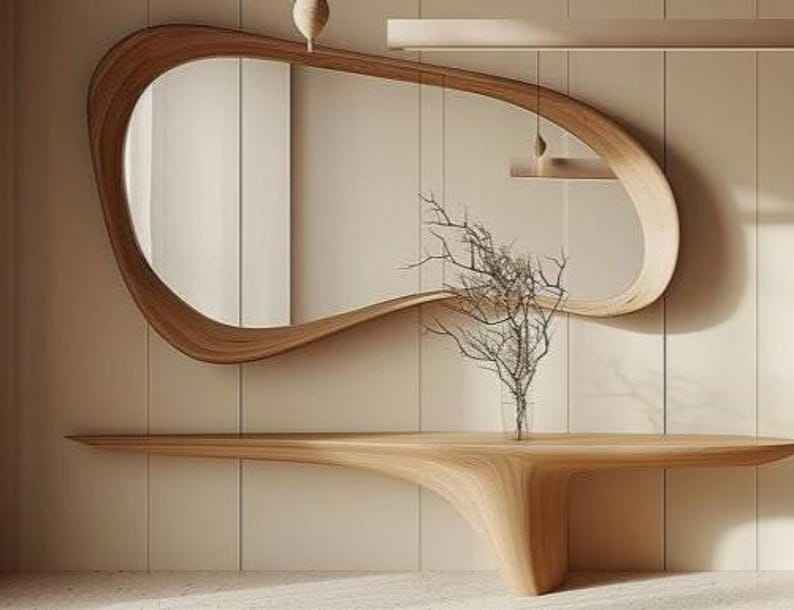 Kalatri กระจกโต๊ะเครื่องแป้งติดผนังขนาดกะทัดรัดน้ำหนักเบาทำจากไม้เป็นมิตรกับสิ่งแวดล้อมดีไซน์หยักไม่สมมาตร