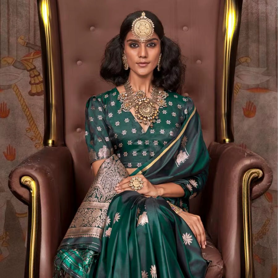 ผ้าส่าหรีสำหรับเด็กผู้หญิง ผ้าซาตินแท้ ทอมือ ลายปิชไว คันธ์กาล่า อะซิเตท