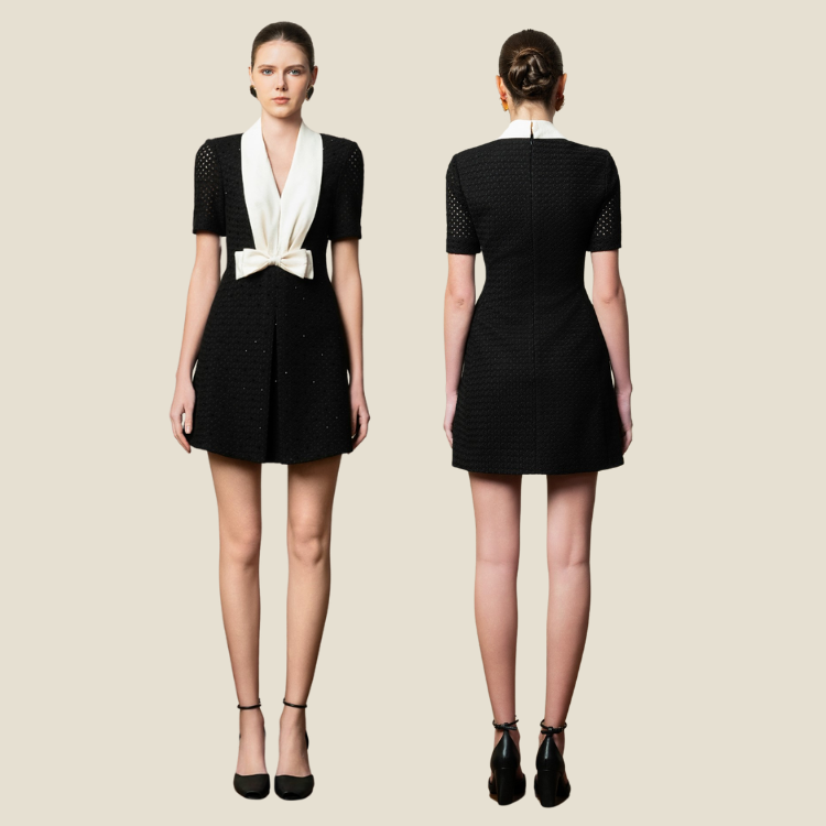 เดรสสั้น KELSEY มีคอกลับด้านประดับด้วยคริสตัลระยิบระยับ ผลิตจากผ้าตาข่ายสไตล์ชนบทสุดหรู