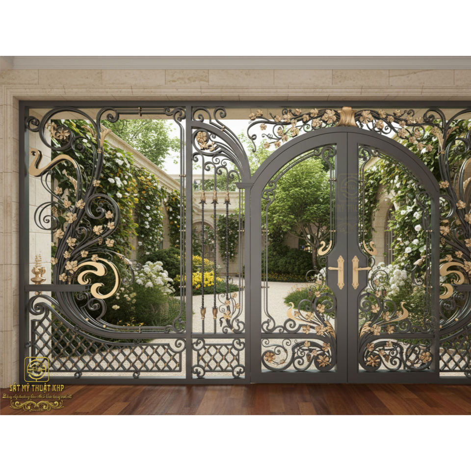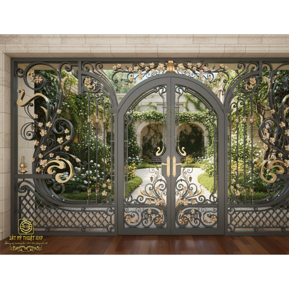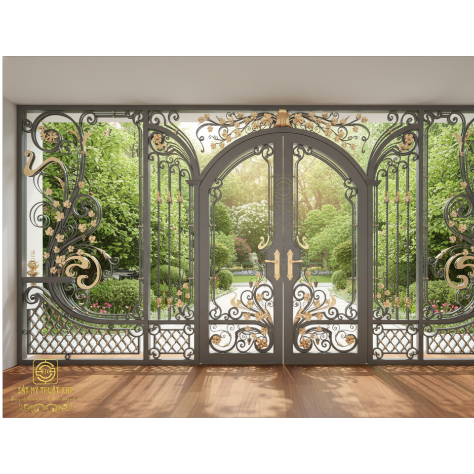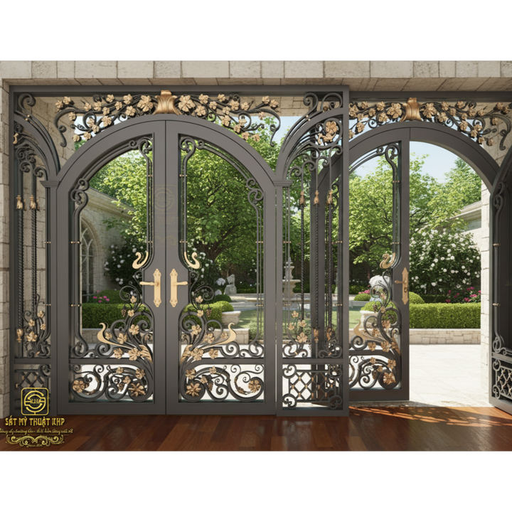 ประตูเหล็กดัดคู่แบบหรูหราทันสมัยสำหรับบ้านวิลล่าขนาดใหญ่ คุณภาพสูง ชุบกัลวาไนซ์ งานฝีมือประณีตจาก KHP