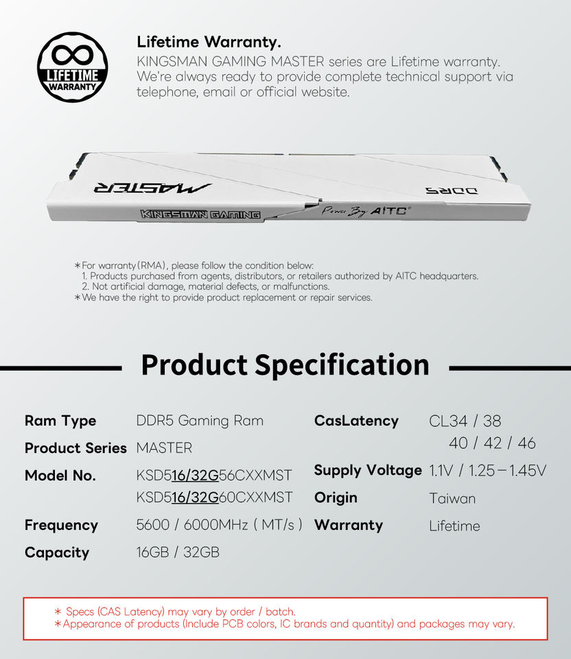 [Kingsman aitc] DDR5ประสิทธิภาพสูง6000MHz 32GB (2x16GB) แรมตั้งโต๊ะแบบ Dual Channel สำหรับโปรเซสเซอร์ Intel AMD มีสินค้าพร้อมส่ง