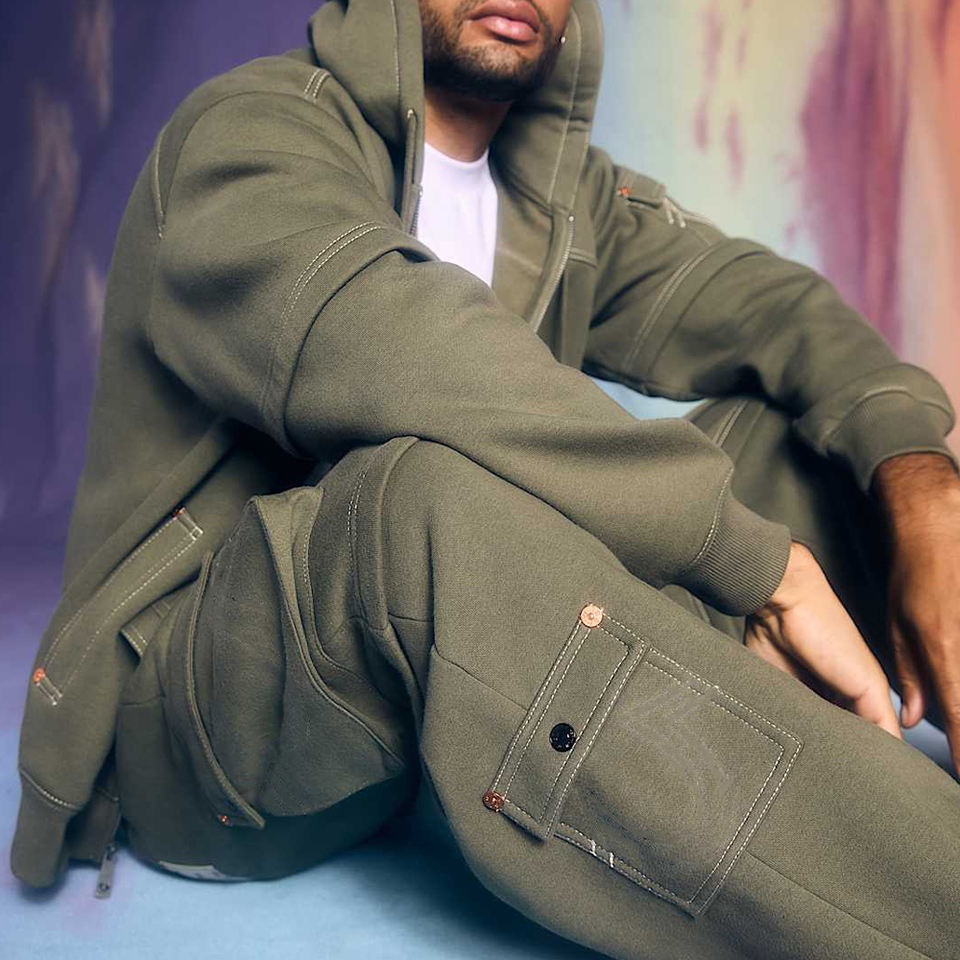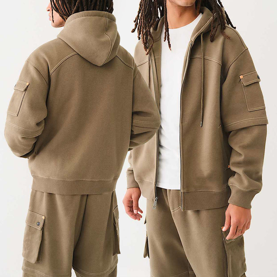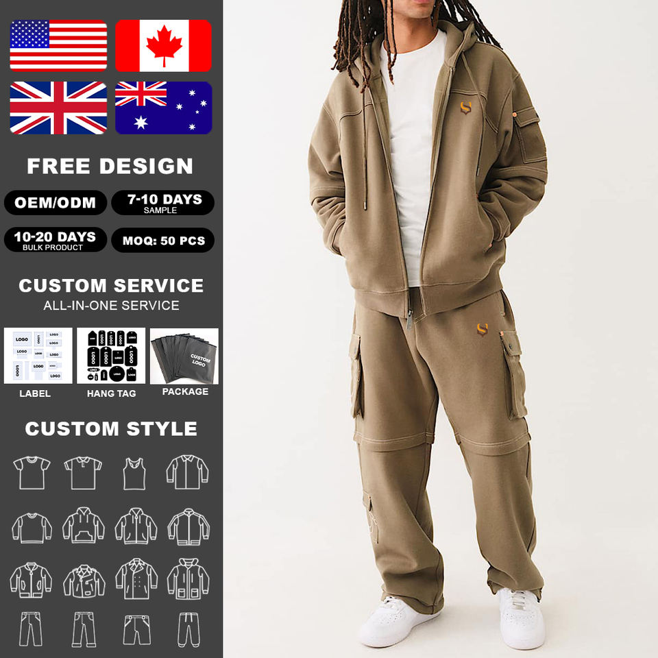 ชุดเซ็ตฮู้ดดี้ซิปหน้าปักโลโก้ตามสั่งขายส่ง KIingSen เสื้อผ้าสตรีทแวร์ระบายอากาศสำหรับผู้ชาย กางเกงคาร์โก้ผ้าฟลีซหนา 480 กรัม สำหรับฤดูหนาว