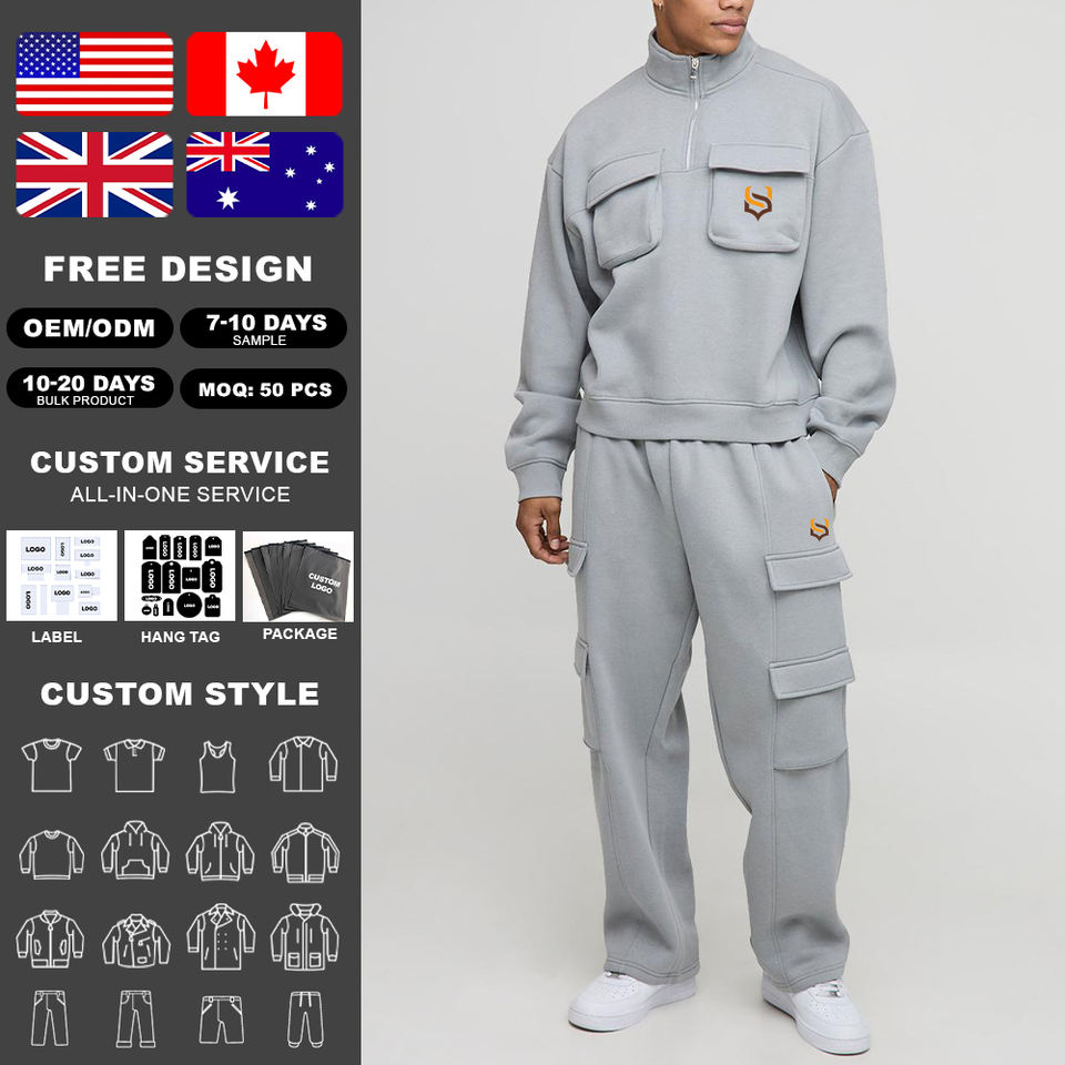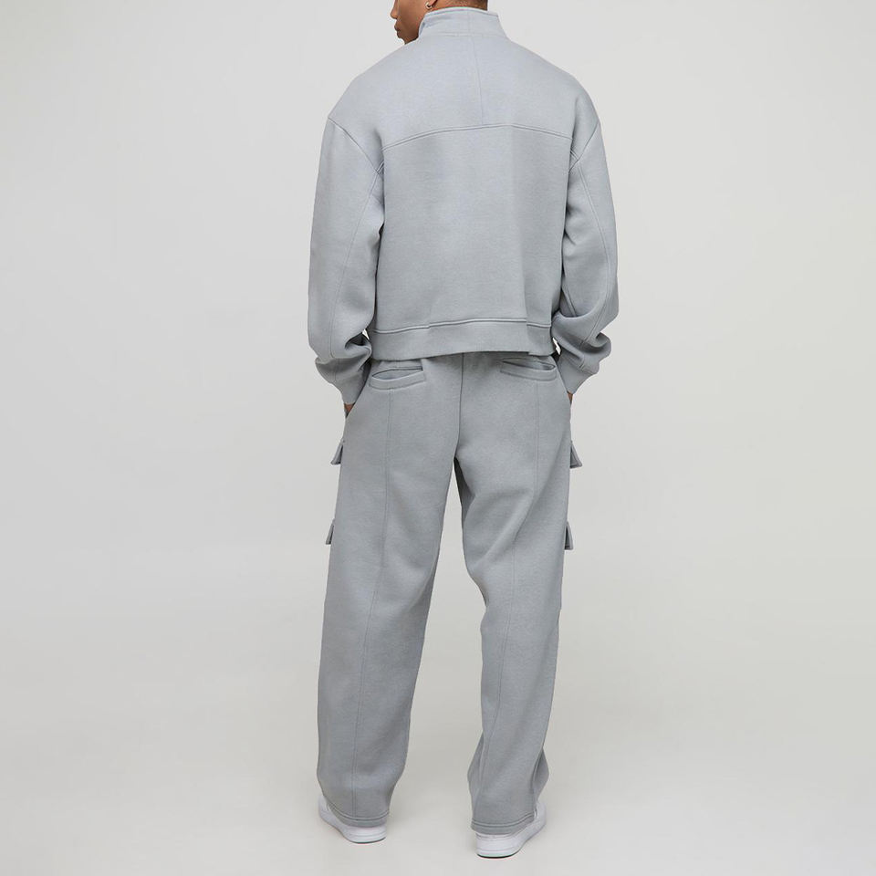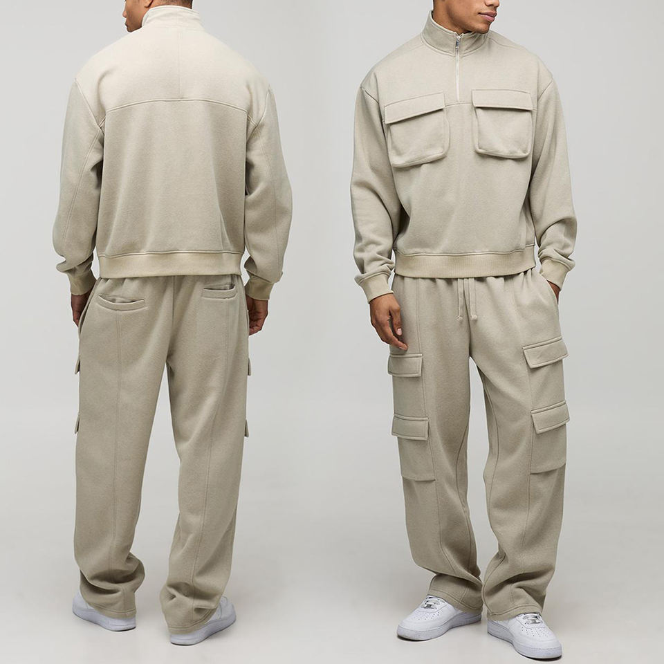 กางเกงคาร์โก้ซิปหน้าผ่าครึ่งตัวสำหรับผู้ชายขายส่ง KIingSen พร้อมเสื้อฮู้ดผ้าฟลีซหนานุ่มระบายอากาศได้ดี 480 กรัม สไตล์สตรีทแวร์แบบต่อผ้า