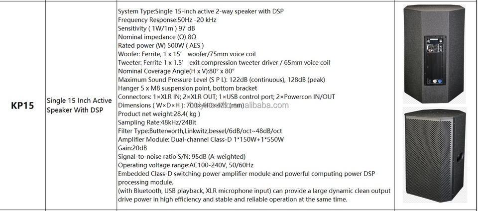 ลำโพง2ทาง KP15แอคทีฟขนาด15นิ้วพร้อมโมดูลเครื่องขยายเสียง DSP ไดร์เวอร์500วัตต์ลำโพงที่ใช้งาน RMS Class D สำหรับการจัดเรียงสาย